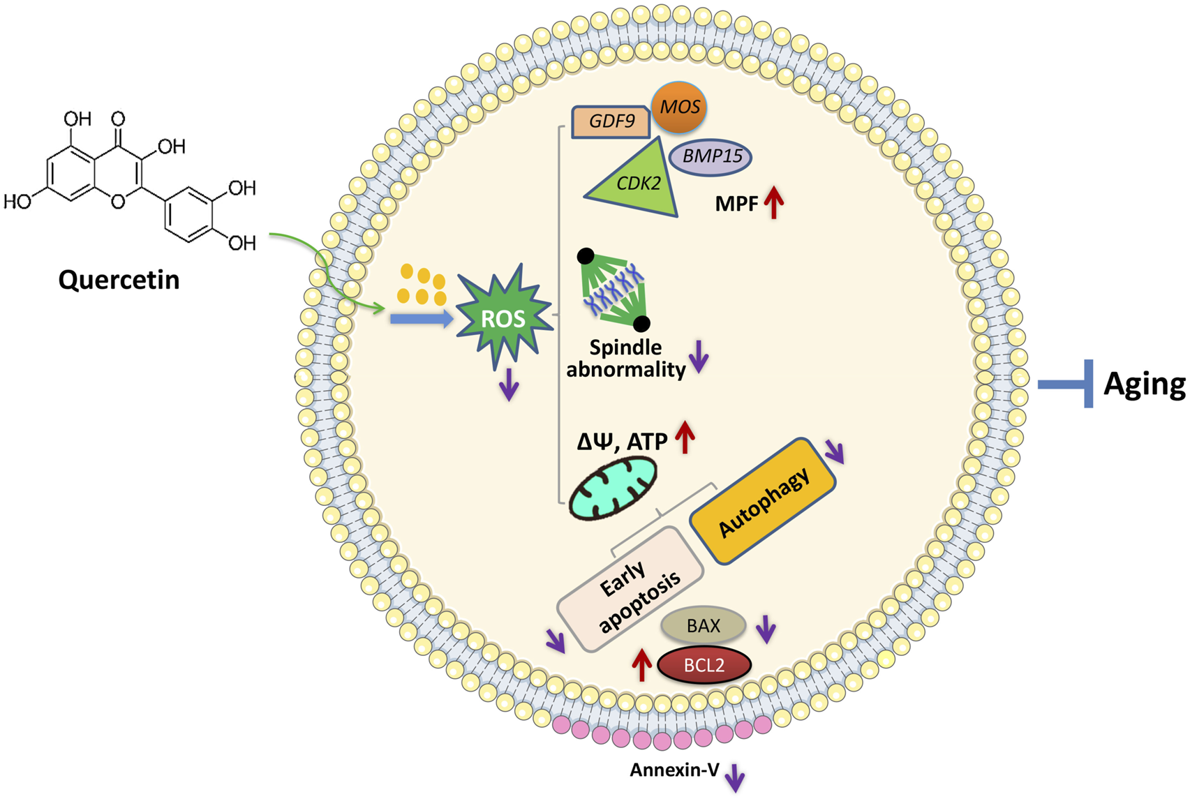 In conclusion, we found that QUE supplementation can effectively improve the IVM of porcine oocytes and the quality of in vitro aged porcine oocytes, mainly through its antioxidant effects, which can reduce ROS accumulation, resulting in the restoration of impaired mitochondrial functions and prevention of early apoptosis, autophagy, and spindle abnormalities (Figure 8). This can aid in the development of new strategies for improving the IVM of porcine oocytes and provide insight into the factors regulating the porcine oocyte aging process.