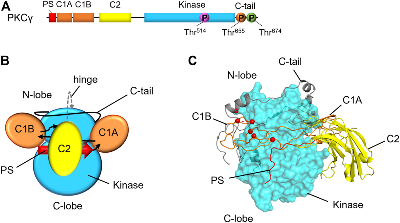 Domain composition and structural model of PKCγ. (A) Primary structure of PKCγ, including the pseudosubstrate (PS, red), C1A and C1B (orange), C2 (yellow), kinase (cyan), and C-tail (black line). Circles indicate the priming phosphorylation sites: activation loop (pink), turn motif (orange) and hydrophobic motif (green). This structure is conserved amongst conventional PKC isozymes with a noteworthy difference is a short Pro-rich extension of the C-tail for PKCγ. (B) Domain architecture of conventional PKCs with domains labeled. Arrows indicate linker direction. (C) Hypothetical model of PKCγ structure based on the previously published model for general architecture of PKC isozymes (Jones et al., 2020; Pilo et al., 2022), showing kinase domain as cyan surface, and the C1 domains and C2 domains in ribbon representation. SCA14 mutations, represented as red spheres, are concentrated in C1B domain or interfaces with the kinase domain.