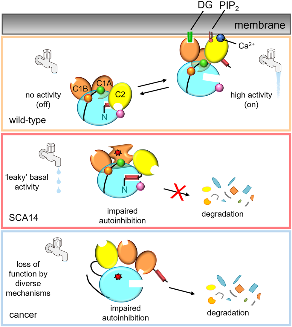 PKCγ mutations in disease lead to differing effects on kinase activity.Top: In the absence of second messengers, wild-type PKCγ adopts an autoinhibited conformation, in which no signaling occurs (water faucet is “off”). In the presence of Ca2+ and DG, wild-type PKCγ adopts an open conformation and is activated (water faucet is “on).Middle: Mutations in SCA14 lead to impaired autoinhibition of PKCγ resulting in “leaky activity”; mutations in the C1 domains protect PKC from down regulation, evading quality control degradation of the impaired PKC. This species can be further activated by second messenger binding for some, but not all, SCA14 mutations (not shown). Bottom: Mutations in cancer lead to loss of PKC function by diverse mechanisms. One common mechanism is by impairing autoinhibition, resulting in the dephosphorylation and degradation of PKC. Mutant PKCγ can also act in a dominant negative manner to suppress signaling by other PKC isozymes.