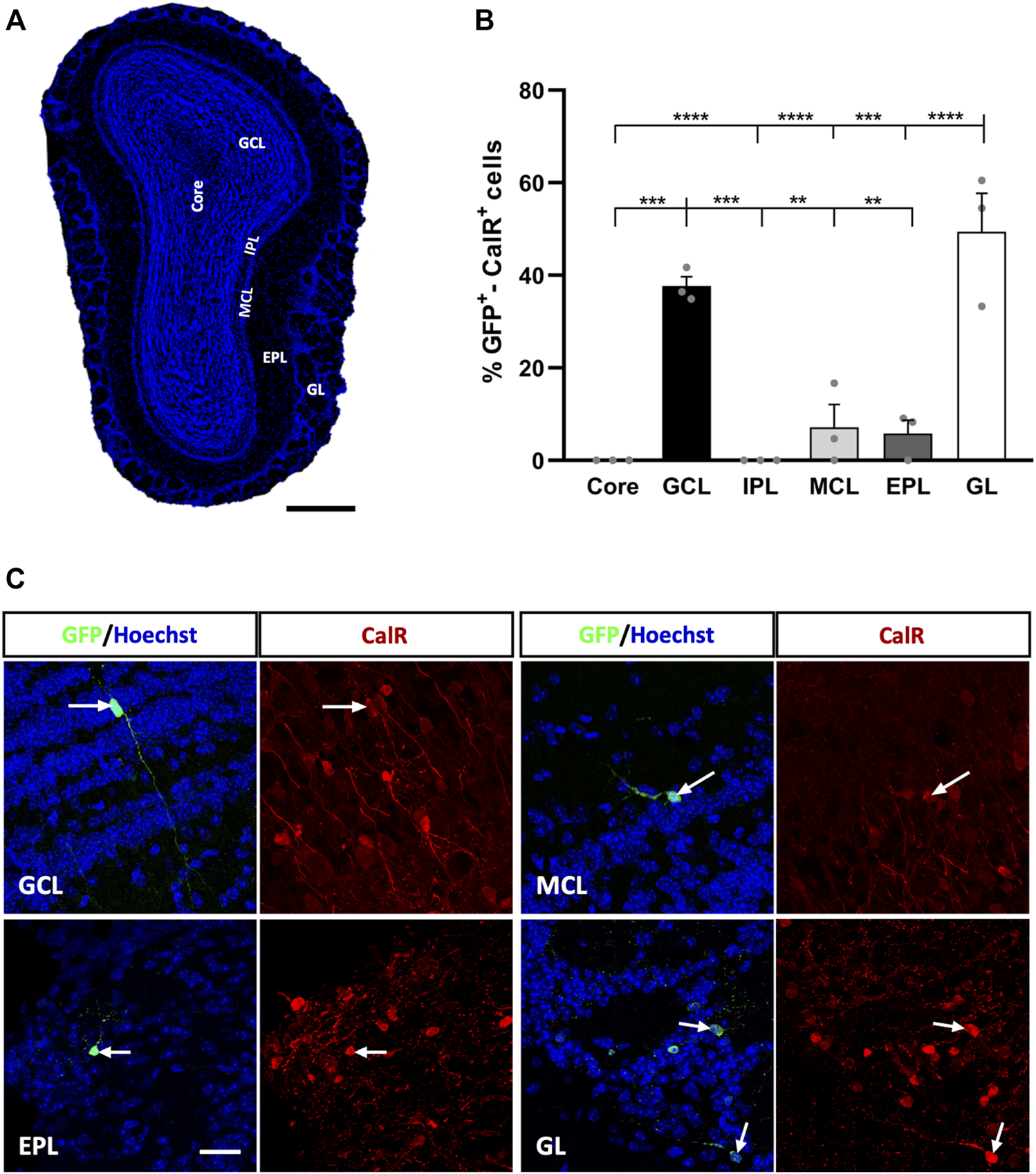 Calretinin interneurons derived from adult OB core-EGFP+ NSCs migrate from the core to different neuronal layers at 21 days post-injection (dpi). (A) Coronal section of the OB stained with Hoechst to show its layers: OB core; GCL, granule cell layer; GL, glomerular layer; IPL, internal plexiform layer; MCL, mitral cell layer; EPL, external plexiform layer. (B) Quantification of GFP+-CalR+ cells in the different layers of the OB. Adult-born CalR+ neurons migrated preferentially towards the GCL (37.67%) and GL (49.43%), while the remaining layers received few neurons (MCL, 7.13%; EPL, 5.8%) or no cells at all (Core and IPL: **p < 0.01, ***p < 0.001, ****p < 0.0001; one-way ANOVA followed by Tukey´s post hoc test). (C) Representative images of neurons in the GCL, MCL, EPL, and GL immunostained for GFP (green) and CalR (red). The bars show the mean ± SEM (n = 3 animals). Scale bars in (A) = 350 μm, (C) = 25 µm.