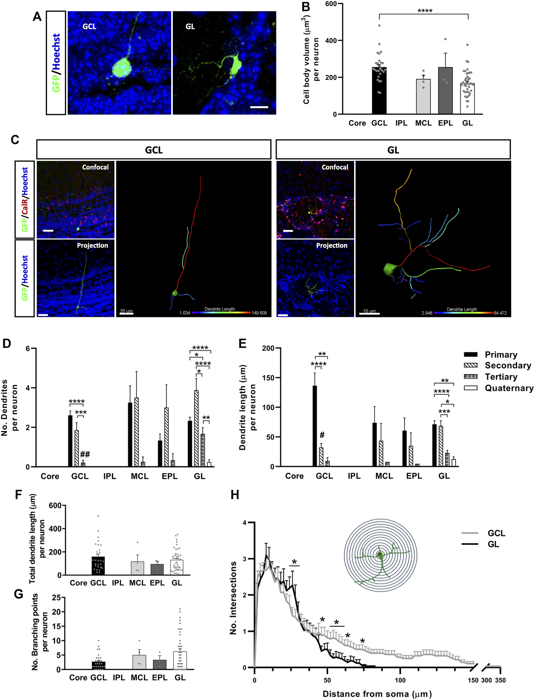 Calretinin neurons derived from adult OB core NSCs have different dendrite morphologies depending on their location in the OB layers. Representative images (A) and quantification (B) of the cell body volume of GFP+ neurons in the different layers of the OB. Neurons in the GCL had a significantly larger soma volume than those in the GL (****p < 0.0001; Kruskal-Wallis with Dunn’s post hoc test). (C) Representative images and 3D projections of the different morphologies displayed by cells located in the GCL and GL. When compared to GL neurons, GCL neurons had fewer (D) but longer dendrites overall (E). The projection image is color-coded for dendrite length and branching. (D) Quantification of the number of dendrites per neuron. Cells from the GCL had more primary and secondary dendrites (***p < 0.001, ****p < 0.0001; Kruskal-Wallis with Dunn’s post hoc test) than tertiary ones, which in turn were significantly less numerous relative to those in GL cells (##p = 0.014; Kruskal-Wallis followed by Dunn’s post hoc test). Neurons located in the GL had significantly more secondary dendrites (*p = 0.028 vs. tertiary, ****p < 0.0001 vs. quaternary; Kruskal-Wallis with Dunn’s post hoc test), and they were the only group to present quaternary dendrites. No significant changes were detected in neurons located in the MCL and EPL. (E) Quantification of the dendrite length per neuron. GCL cells had the longest primary dendrites (**p = 0.010, ****p < 0.0001; Kruskal-Wallis with Dunn’s post hoc test), although the differences were not significant relative to GL neurons (p = 0.0719; Kruskal-Wallis followed by Dunn’s post hoc test). In terms of GL neurons, primary and secondary dendrites were similar in length but significantly longer than the tertiary and quaternary dendrites (*p < 0.05, **p < 0.01, ***p < 0.001, ****p < 0.0001; Kruskal-Wallis with Dunn’s post hoc test). There was also a significant difference in secondary dendrite length between GCL and GL neurons (#p = 0.0326; Kruskal-Wallis with Dunn’s post hoc test). Intragroup variability didn’t show significant differences in total dendrite length (F) or in the number of branching points per neuron (G). However, distinct branching patterns were observed between GCL and GL cells after performing a Sholl analysis (H). GL neurons had more intersections 25–30 µm away from the soma, while GCL neurons presented a higher number of intersections 50–70 µm away from the cell body and they extended as far as 350 µm (*p < 0.05; two-way ANOVA followed by Bonferroni’s post hoc test). The bars show the mean ± SEM: n = 28 (GCL), 4 (MCL), 3 (EPL), 42 (GL) cells (B,D–G); n = 28 (GCL), 42 (GL) cells (H). Scale bars in (A) = 10 μm (C) = 30 µm (confocal and projection images), 20 µm (isolated GCL neuron), 10 µm (isolated GL neuron). EPL, external plexiform layer; GCL, granule cell layer; GL, glomerular layer; IPL, internal plexiform layer; MCL, mitral cell layer.