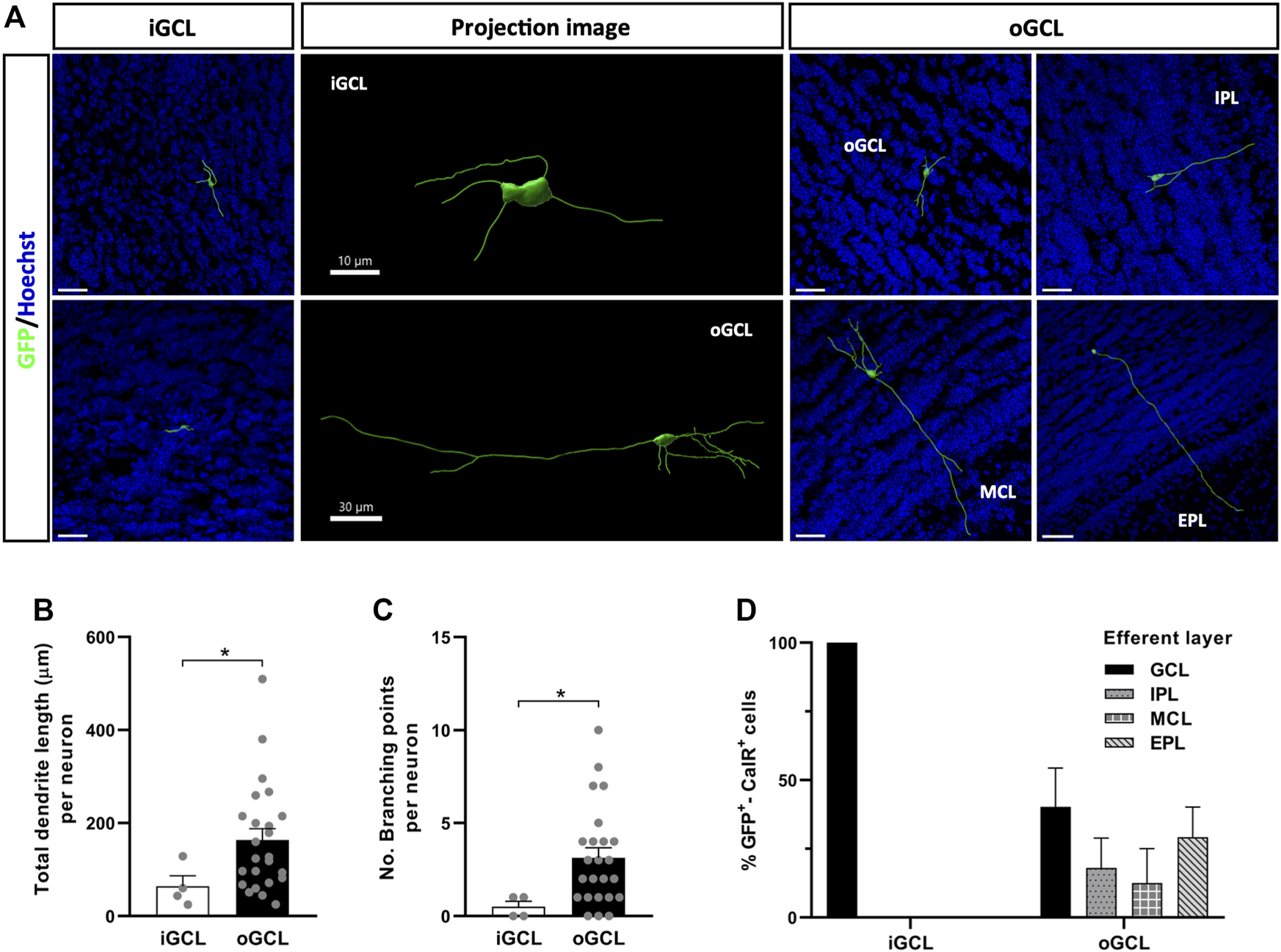 Different types of OB core-derived calretinin neurons are present in the GCL of the adult OB. (A) Representative 3D projections of neurons from the different portions of the GCL showing their distinct neuronal morphologies and the different layers they project to. (B) Neurons from the oGCL (86% of the total cells found in the GCL) had a larger total dendrite length (*p = 0.048; Mann-Whitney U-test) and more branch points per neuron (C) relative to iGCL neurons (*p = 0.027; Mann-Whitney U-test). (D) Dendrites of GCL neurons contact different layers, here defined as the efferent layer. All iGCL cells and 40% of the oGCL cells did not establish contacts with cells in other layers of the OB. Dendrites from the remaining 60% of the oGCL neurons were able to reach the EPL (29.17%), IPL (18.03%) or MCL (12.5%), with no significant differences in these percentages. The bars show the mean ± SEM: n = 4 (iGCL), 24 (oGCL) (B,C); n = 4 (iGCL), 10, 5, 3, 6 (oGCL) cells (D). Scale bars in (A) = 30 µm. EPL, external plexiform layer; GCL, granule cell layer; iGCL, internal granule cell layer; IPL, internal plexiform layer; MCL, mitral cell layer; oGCL, outer granule cell layer.