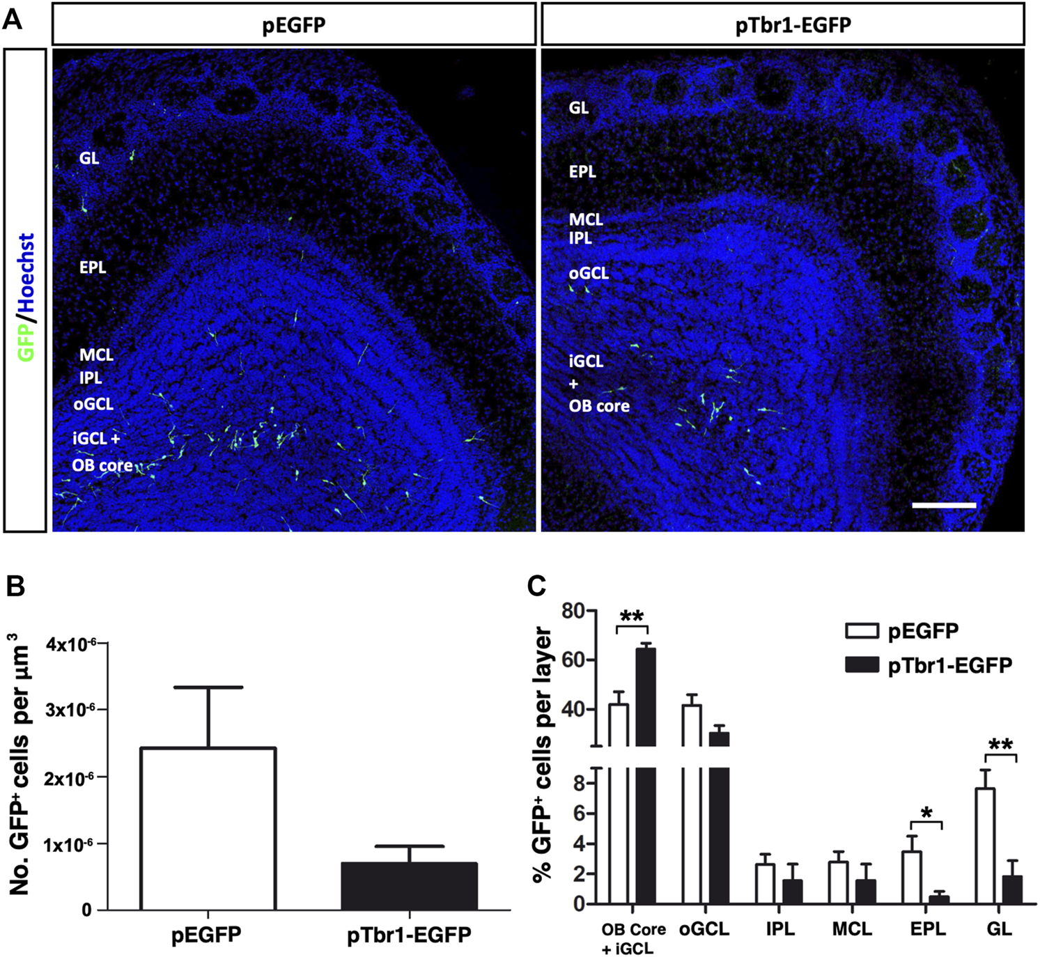 Tbr1 overexpression in the adult OB core affects the distribution of GFP+ cells across the different layers of the adult OB at 7 dpi. (A) Coronal sections of the OBs injected with the EGFP or Tbr1-EGFP particles showing distinct patterns of migration. (B) Fewer GFP+ cells were detected in the pTbr1-EGFP animals, although the difference wasn’t statistically significant. (C) Quantification of the GFP+ cells in each layer. The pTbr1-EGFP animals has a higher percentage of cells in the Core + iGCL (**p = 0.0028; unpaired Student’s t test), yet a significantly lower proportion of neurons in the EPL (*p = 0.0315; unpaired Student’s t test) and GL (**p = 0.0051; unpaired Student’s t test). The bars show the mean ± SEM, n = 6 animals per condition. Scale bars in (A) = 150 µm.