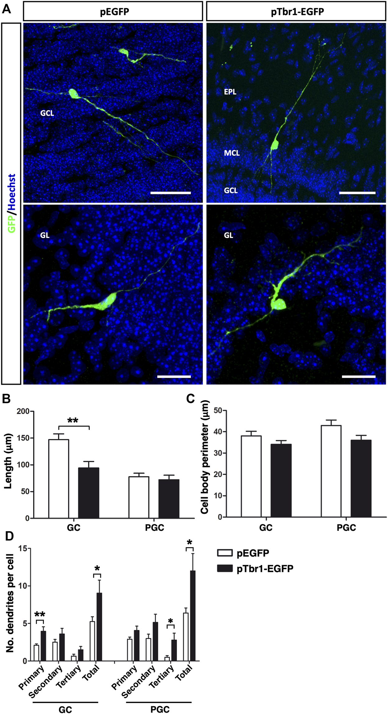 Tbr1 overexpression in the adult OB core influences the morphology of newly born GCs and PGCs. (A) Immunohistochemical staining for GFP showing the distinct morphologies acquired by GCs and PGCs in control (pEGFP) and Tbr1 overexpressing (pTbr1-EGFP) OBs. Quantification of these differences revealed a reduction in total dendrite length (B) on the GCs of pTbr1-EGFP animals (**p < 0.01; unpaired Student’s t test), while the cell body perimeter (C) remained similar in both conditions. (D) The total number of dendrites was greater for both GCs and PGCs when Tbr1 was overexpressed (*p < 0.05; unpaired Student’s t test). More specifically, there was an increase in the number of primary dendrites on the GCs (**p < 0.01; unpaired Student’s t test) and significantly more tertiary dendrites on PGCs (*p < 0.05; unpaired Student’s t test) in pTbr1-EGFP animals than in their control counterparts. The bars show the mean ± SEM: n = 20 (GCL), 15 (GL) cells. Scale bars in (A) = 50 µm (upper images), 25 µm (lower images).