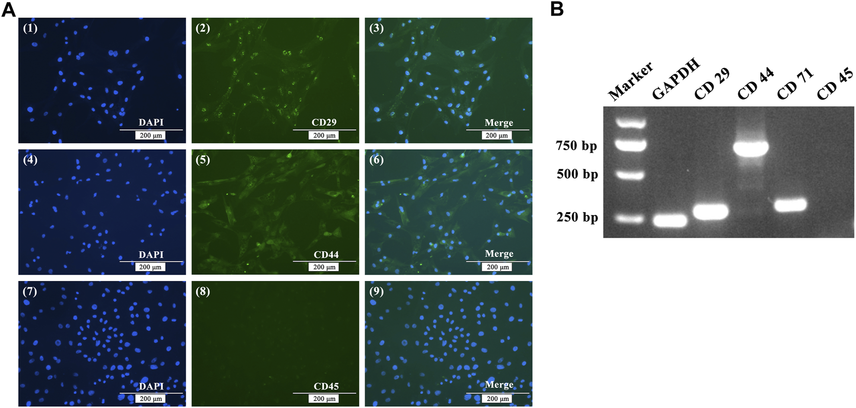 Immunofluorescence staining (A) and RT-PCR (B) analysis of BMSC cell surface markers. (A) Immunofluorescence showing positive staining for CD29 and CD44, but negative for CD45. (B) RT-PCR assays showed that the expression of GADPH, CD29, CD44 and CD71 were positive, while the expression of CD45 was negative.