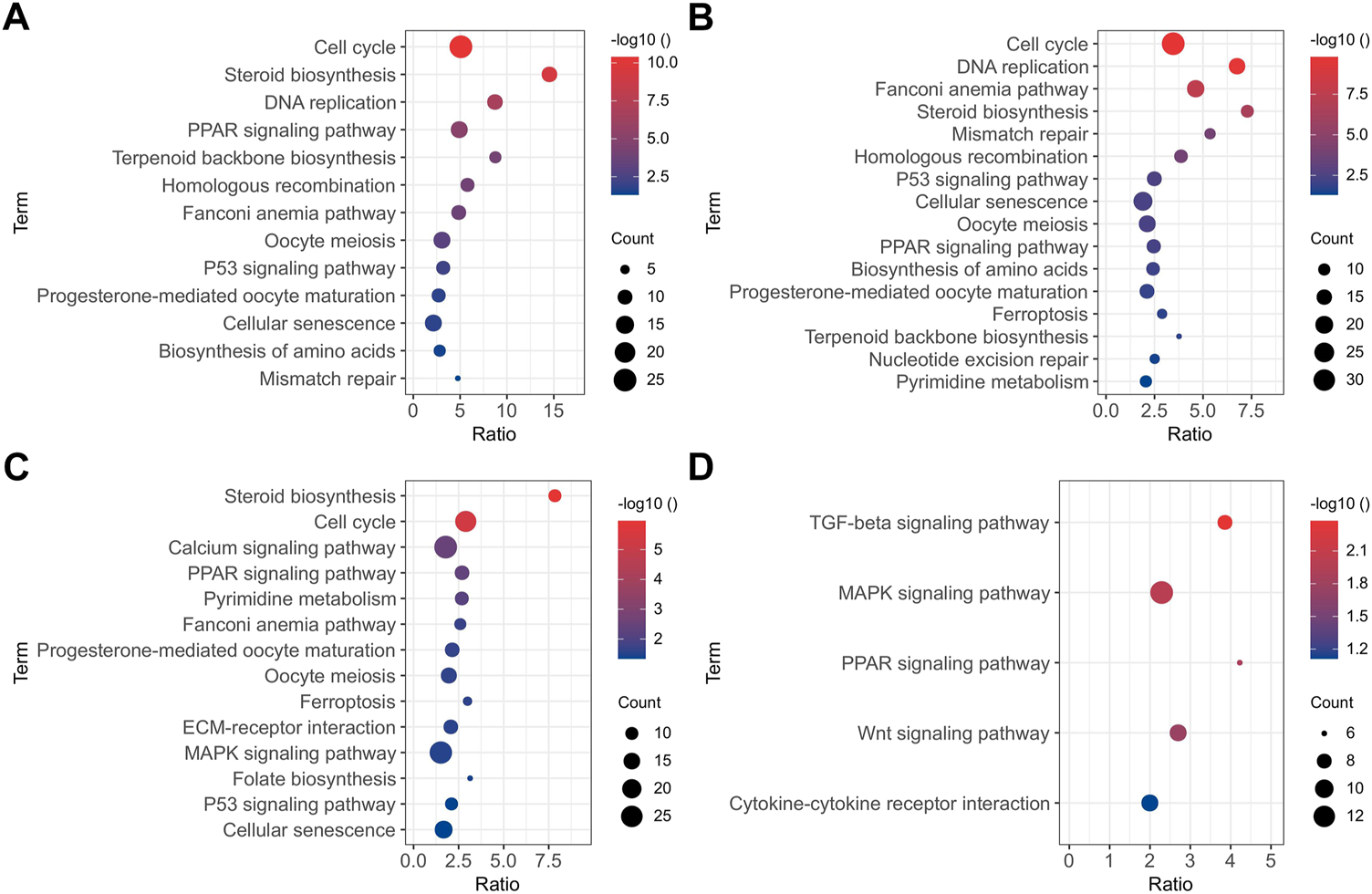 KEGG pathway analysis (p < 0.05) of DEGs between 0 and -1 (A), 1 and 0 (B), 11 and 1 (C), and 22 and 11 (D) d of osteogenic induction.