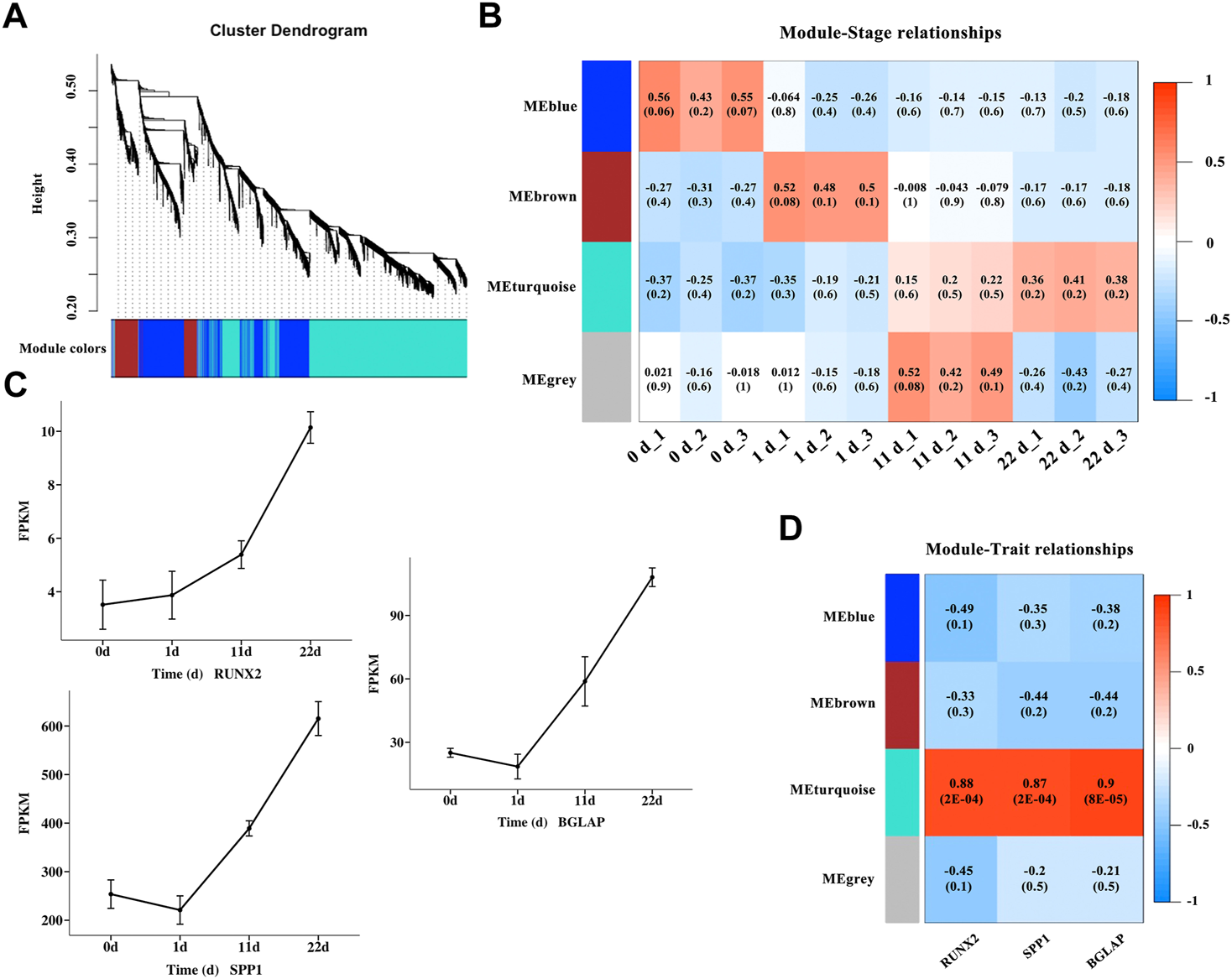 Identification of modules associated with osteogenic differentiation in different induction stages. (A) Clustering dendrogram of DEGs in different osteogenic induction groups. As a result, 4 modules with different colors were constructed. (B) Module-trait association and the corresponding p-value with all the DEGs (listed in Supplementary Table S4) at different osteogenic induction time. (C) The mRNA variation tendency of genes RUNX2, SPP1 and BGLAP. Horizontal coordinate represents the induction time. The ordinate represents the changes of fragments per kilobase per million (FPKM). (D) Module-gene correlations and the corresponding p-value of genes RUNX2, SPP1 and BGLAP.
