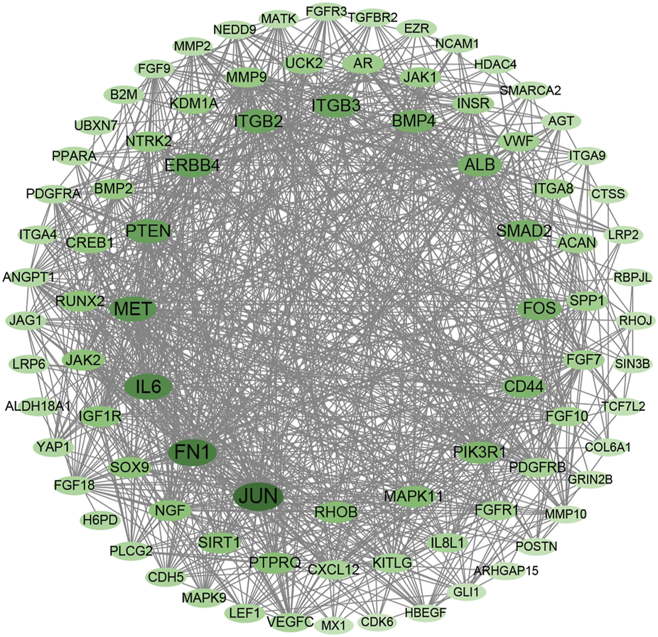 A protein–protein interaction (PPI) network was constructed for DEGs in the MEturquoise module with STRING database and Cytoscape. A total of 87 nodes with the top 5%-degree value calculated by CytoNCA (Supplementary Table S6) were mapped to the PPI network (Figure 5), including JUN, FN1, IL6, MET, PTEN, ERBB4, ITGB2, ITGB3, BMP4, RUNX2, and SPP1.