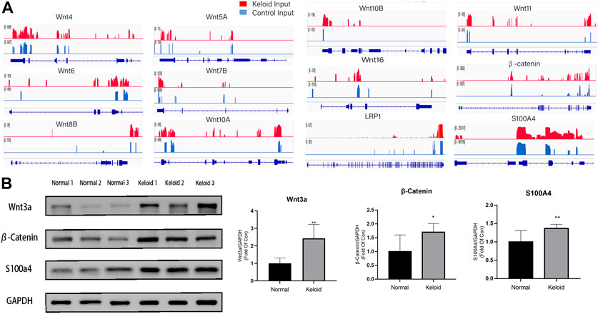FIGURE 4. Difference between the m6A modification and the activation of the Wnt/β-catenin pathway between the two groups. (A) m6A modification of LRP1, Wnt isoforms, and β-Catenin in keloid compared with that in NS in the combined analysis of MeRIP-seq and RNA-seq. (B) Protein expression of the Wnt/β-catenin/S100A4 proteins in keloid compared with that in NS. *p < 0.05, **p < 0.01.