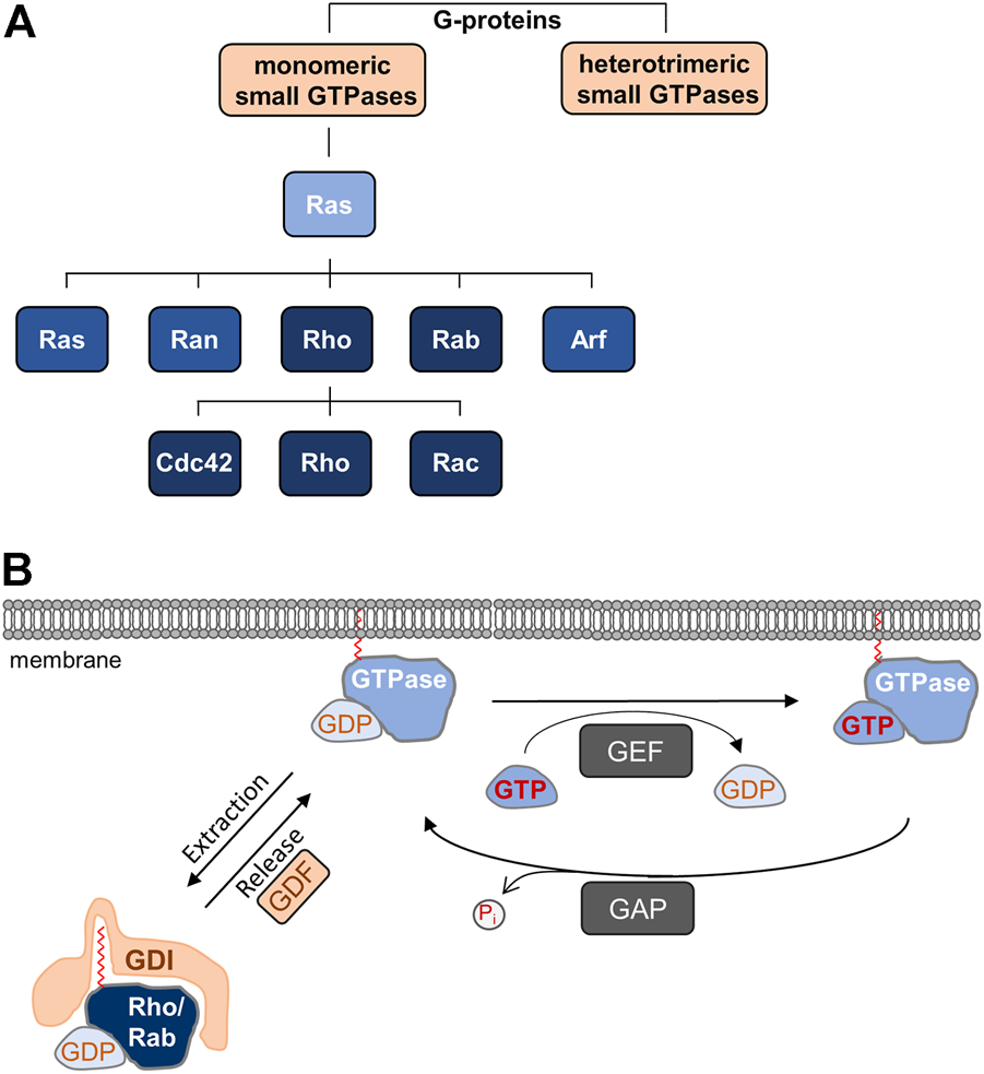 FIGURE 1. (A) Monomeric small GTPases belong to G-proteins. Ras is the founding member of the Ras superfamily of monomeric small GTPases, which is divided in five families. The Rho family is further subdivided into the Cdc42, Rho, and Rac subfamilies. (B) Cyclic regulation of monomeric small GTPases. Monomeric GTPases are anchored in membranes through prenyl groups. Local guanine nucleotide exchange factors (GEFs) catalyze the exchange of GDP by GTP resulting in the active GTPase, whereas local GTPase-activating proteins (GAPs) hydrolyze GTP to release inorganic phosphate (Pi), which results in the inactivation of the GTPase. Rho and Rab family GTPases are sequestered in the GDP-bound, inactive form to the cytosol by guanine nucleotide dissociation inhibitors (GDIs), which mask the prenyl groups required for membrane insertion. Through the activities of GDI displacement factors (GDFs), inactive GTPases are released from GDI-inhibition allowing membrane localization.