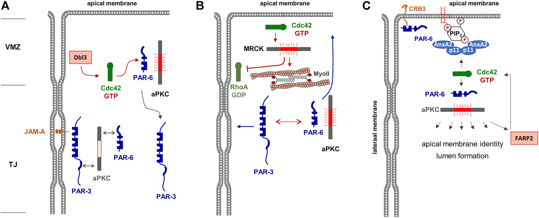 FIGURE 2. Regulation of apical membrane identity in polarized epithelial cells. (A) The Par—aPKC complex is localized at the TJs, most likely through PAR-3 interacting with JAM-A. The Cdc42 GEF Dbl is localized at the vertebrate marginal zone (VMZ) and activates Cdc42, which in turn interacts with PAR-6 and induces a conformational change of PAR-6 that allows activation of aPKC. Phosphorylation of PAR-3 results in the dissociation of PAR-3. Note that this is a dynamic cycle, and that the stable association of the heterotrimeric PAR-3—aPKC - PAR-6 complex may be short-lived. (B) Active Cdc42 activates MRCK which stimulates actomyosin contractility-mediated segregation of PAR-3 and PAR-6—aPKC (dotted line with double arrows) to lateral and apical membrane domains, respectively (blue arrows). In addition, MRCK inhibits RhoA at the lateral membrane domain. (C) A tetrameric complex of Annexin A2 (AnxA2) and p11 is localized in the apical membrane by interacting with phosphatidyl-inositol-4,5-bisphosphate (PIP2). This complex recruits and activates the PAR-6—aPKC complex which phosphporylates various substrates involved in apical membrane identity and lumen formation. Among its substrates is the Cdc42 GEF FARP2, which catalyzes GDP-exchange of Cdc42, providing a possible positive feedback loop of Cdc42 activation in the apical membrane. Note that CRB3 present in the apical membrane may provide an additional anchor for PAR-6 and possibly the PAR-6—aPKC complex.