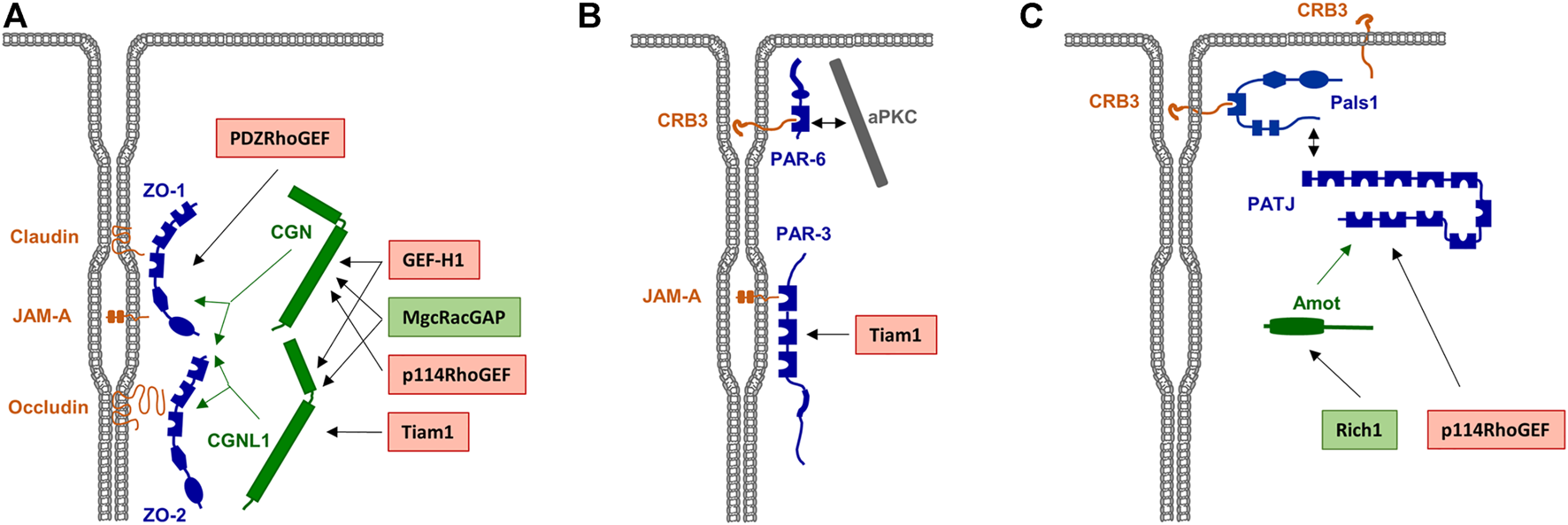 FIGURE 3. Scaffolding proteins for RhoA family GEFs and GAPs a the TJs. (A) Rho family GEFs and GAPs associated with the Zonula occludens (ZO) complex. ZO-1 and ZO-2 directly interact with various integral membrane proteins like Occludin, Claudins and JAM-A. Rho family GEFs and GAPs can directly interact with the ZO complex but also indirectly through the adapter proteins cingulin (CGN) and cingulin-like 1 (CGNL1), which interact with ZO proteins as indicated by green arrows. GEFs and GAPs are indicated in red and green boxes, respectively. (B) RhoA GEFs associated with the PAR—aPKC complex. PAR-3 directly interacts with JAM-A. The RhoA GEF Tiam1 directly interacts with PAR-3. (C) Rho family GEFs and GAPs associated with the CRB3—Pals1—PATJ complex. PATJ is associated with the membrane through Pals1 and CRB3. The interaction of Rich1 with PATJ is mediated by Amot, p114RhoGEF directly interacts with PATJ.