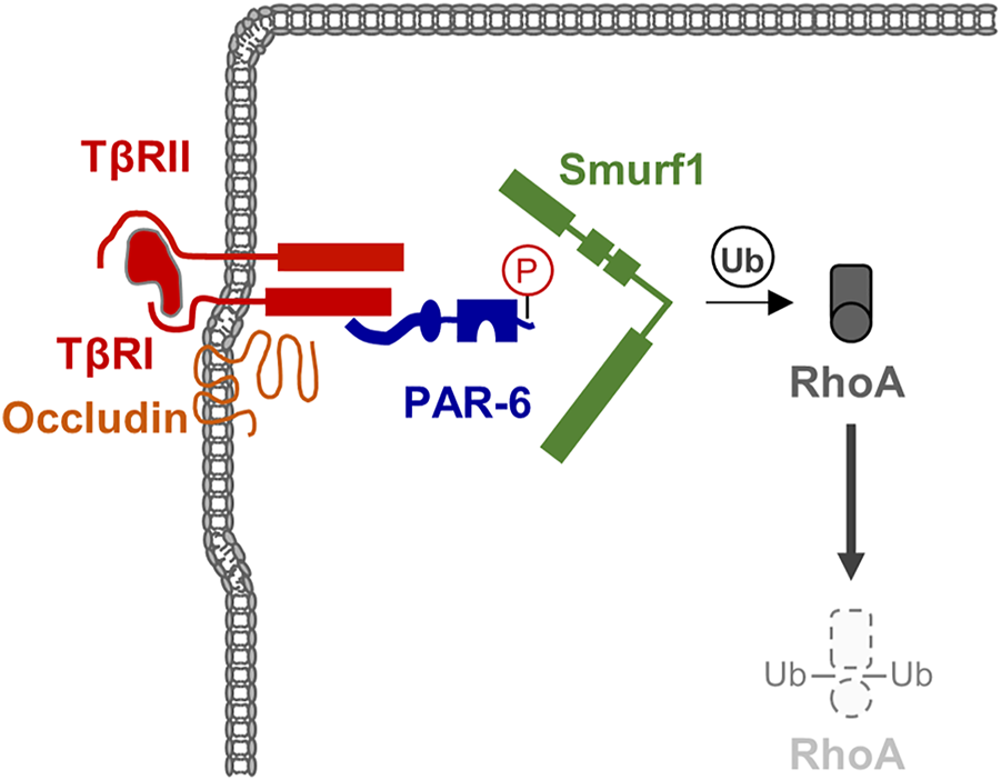 FIGURE 4. TGFβ signaling triggers RhoA degradation during EMT. TGFβ receptors are localized at theTJ through the interaction of TβRI with Occludin. TGFβ signaling triggers phosphorylation of PAR-6 resulting in the recruitment of the ubiquitin ligase Smurf1 and subsequent ubiquitination and degradation of the local pool of RhoA.