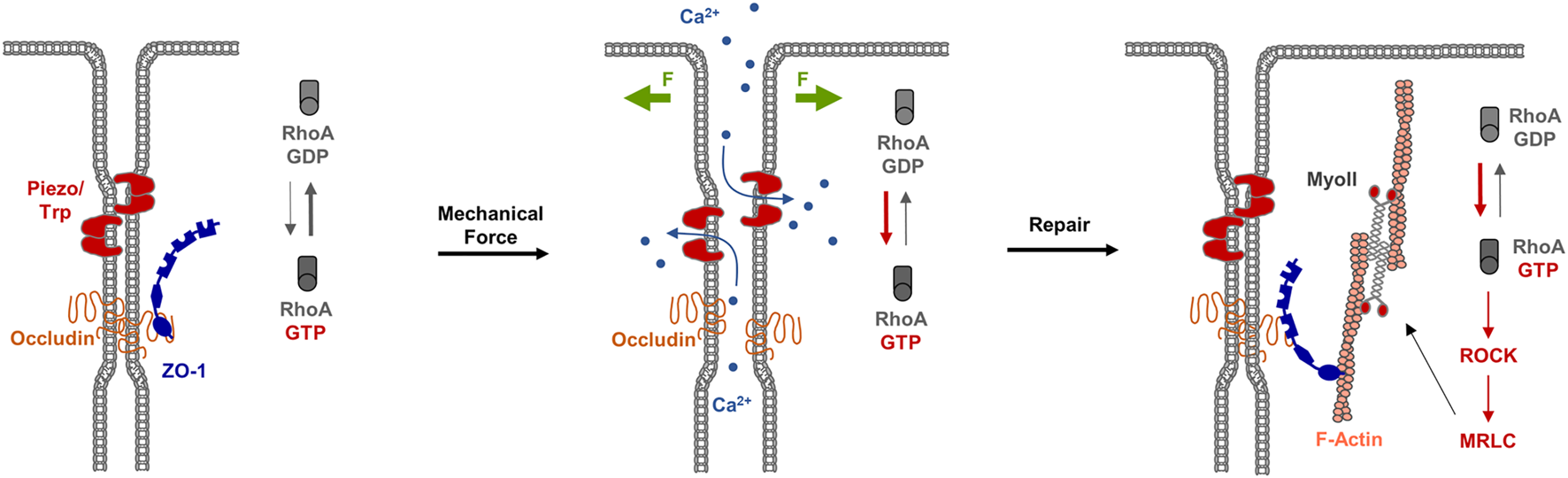 FIGURE 5. RhoA flares repair TJ breaches. Left panel: Under steady state conditions, TJs form a functional barrier that prevents the free diffusion of small solutes along the paracellular pathway. Mechanosensitive receptors like Piezo or Transient Receptor Potential (TRP) channels are inactive. Middle panel: Mechanical forces (F, green arrows) trigger the activation of Piezo / TRP mechanosensitive Ca2+ channels, which results in an influx of Ca2+ ions and the activation of the local pool of RhoA. Right panel: The local pool of active RhoA stimulates ROCK and MRLC resulting in actomyosi-based contractility and TJ repair.