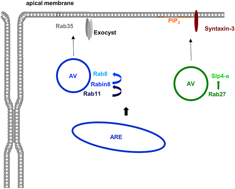 FIGURE 6. Rab proteins in apical membrane traffic. Several Rab proteins are known to participate in the delivery of material to the apical membrane domain in polarized epithelial cells. Apically destined vesicles (AV) contain Rab11 which recruits the Rab8 GEF Rabin8 thereby activating Rab8. Rab35 and the exocyst complex are most likely involved in the apical membrane targeting of these vesicles. Another class of apically destined vesicles operating in the formation of an apical lumen in 3D are positive for Rab27 (and most likely also Rab3 isoforms). The Rab27 effector Slp4-a is targeted to these vesicles and most likely functions in conjunction with Slp2-a to tether the vesicles at PtdIns(4,5)P2-rich apical membrane domains with fusion eventually mediated by syntaxin-3. Most likely, both types of vesicles originate at the apical recycling endosome (ARE) although formation at the TGN is also feasible at least for the Rab27 positive vesicles.