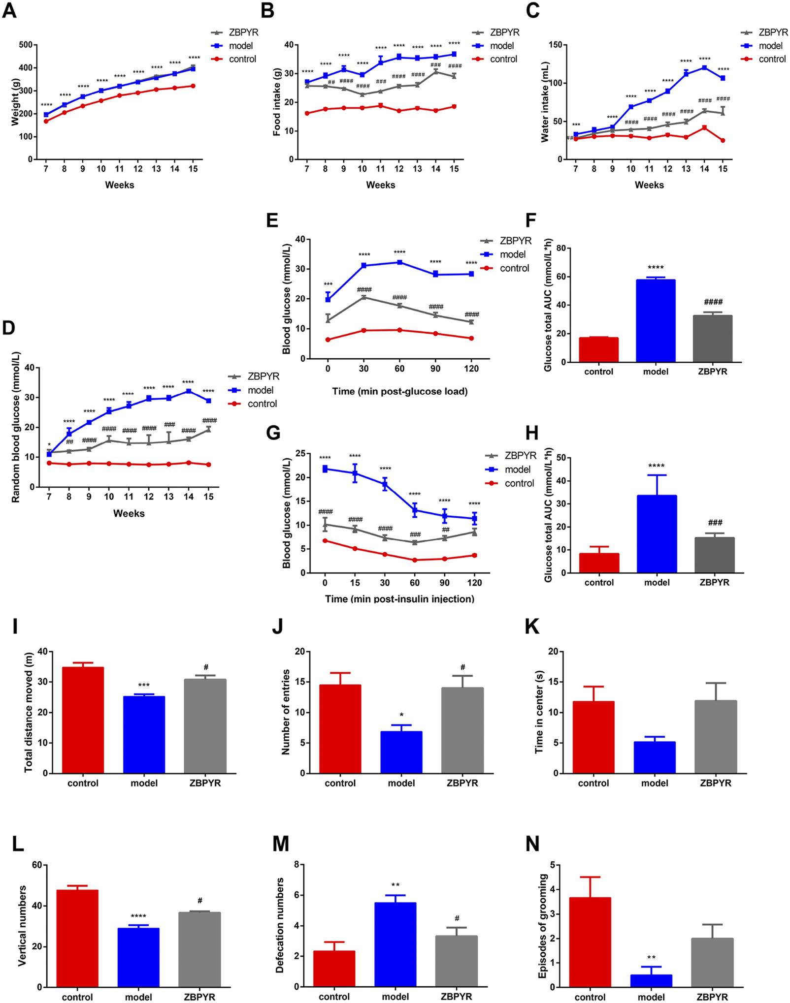 Effects of ZBPYR on physiological parameters, RBG, OGTT, ITT, and exploratory behavior. (A–C) Effects of ZBPYR on body weight (A), food intake (B), and water intake (C). These physiological paramete were measured daily at 7–15 weeks old. (D–H) Effects of ZBPYR on RBG, OGTT, and ITT. RBG (D) was measured at 7–15 weeks of age. Line charts show the levels of blood glucose in the OGTT (E) and ITT (G), respectively. Histograms show the total glucose area under the curve (AUC) in the OGTT (F) and ITT (H), respectively. (I–N) Effect of ZBPYR on activities in the open-field test. Total distance (I), number of entries (J), time in center (K), vertical numbers (L), defecation numbers (M), and episodes of grooming (N) were measured. *p < 0.05, **p < 0.01, ***p < 0.001, ****p < 0.0001, model vs. control; #p < 0.05, ##p < 0.01, ###p < 0.001, ####p < 0.0001, ZBPYR vs. model (mean ± SEM, n = 6 per group).