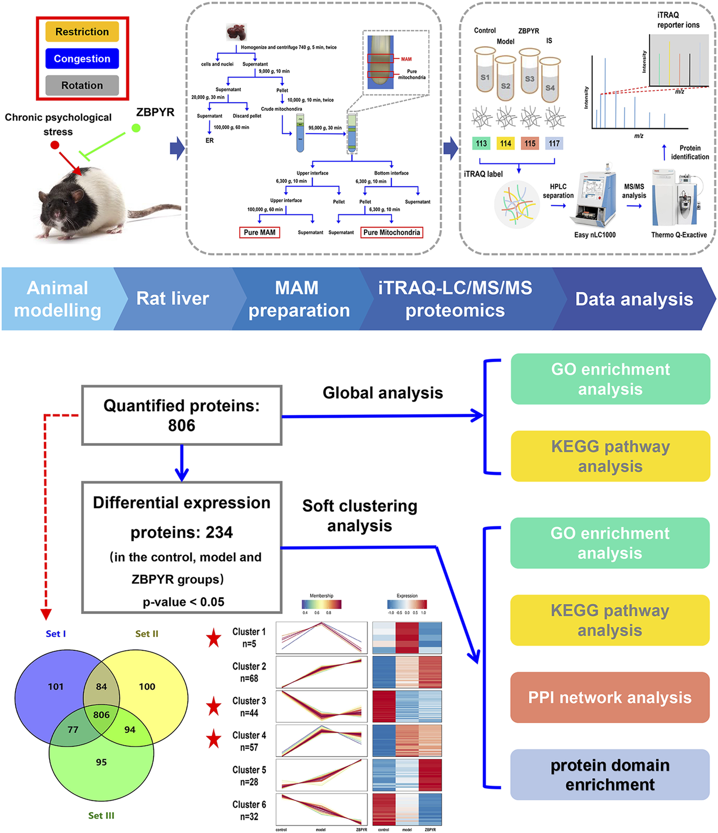 Proteomics workflow. The animal was exposure to three chronic psychological stressors (i.e., restriction, rotation, and congestion). Fresh liver tissue MAM was extracted using gradient centrifugation, and lysis proteins were labeled by an iTRAQ 8-plex. The peptides were subsequently analyzed by LC-MS/MS technology. Peptides were identified and quantified according to the iTRAQ reporter area, and relative protein quantification was inferred from these values. The 234 differentially expressed proteins (DEPs) of the control, model, and ZBPYR groups were analyzed by global analysis and soft clustering analysis. Based on bioinformatics analysis (GO enrichment analysis, KEGG pathway analysis, PPI network analysis, and domain enrichment analysis), key pathways and proteins were screened.