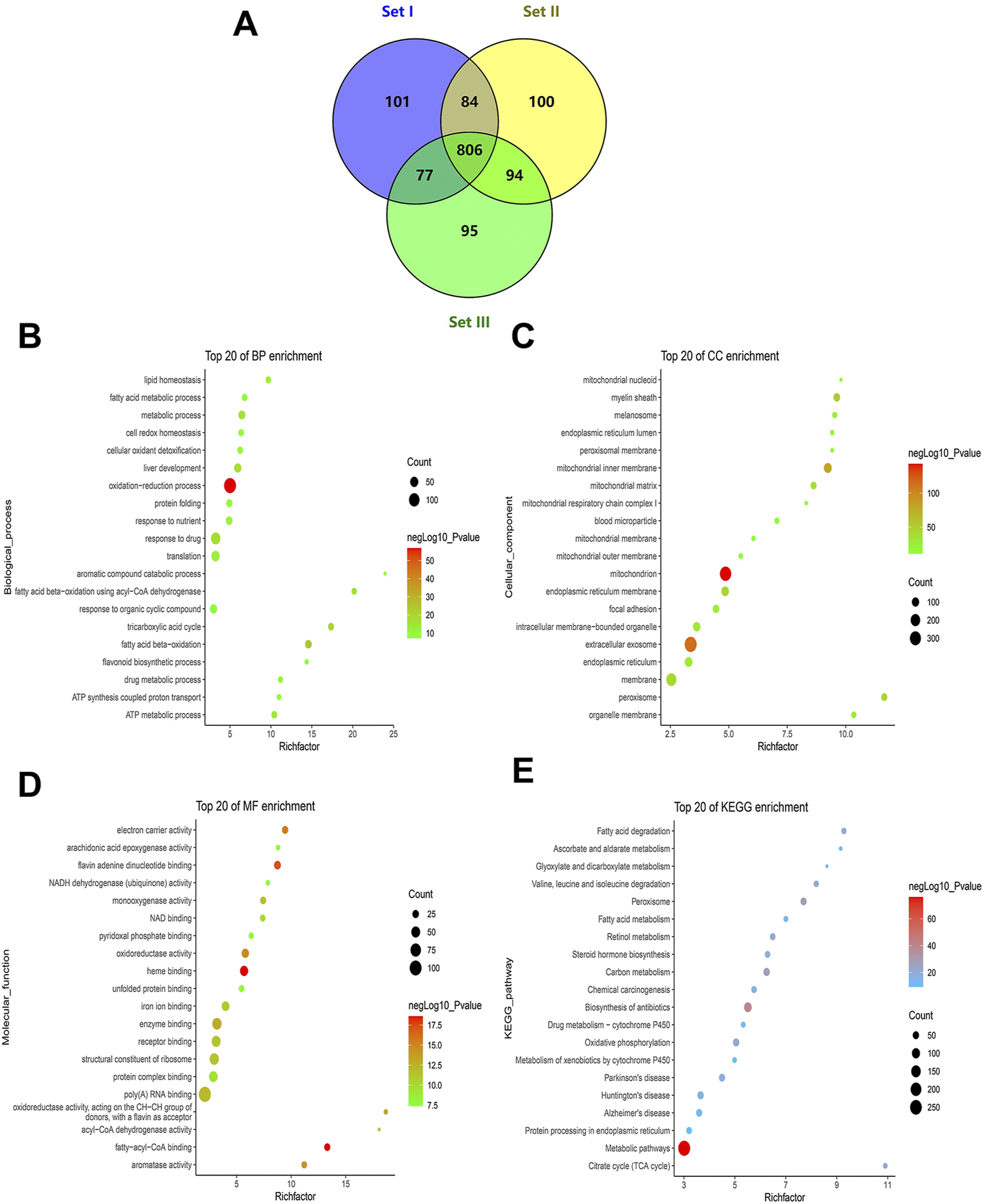 Profile of quantitative MAM proteins identified in the liver. (A) Venn diagram of the number of non-redundant proteins in technical triplicate analysis. (B–D) Profile of GO enrichment analysis of the quantitative proteins, including biological process (BP), cellular component (CC), and molecular function (MF). Bubble charts show the terms of BP (B), CC (C), and MF (D), respectively. (E) A bubble chart showing terms of the KEGG pathway. The top 20 terms sorted by p-values for each category are displayed, with the y-axis showing the categories (BP, CC, MF, and KEGG) and the x-axis showing the rich factor (rich factor = number of DEPs enriched in the categories/number of all proteins in background protein set). The color and size of bubbles indicate the significance of enrichment and the number of DEPs enriched in the categories, respectively.