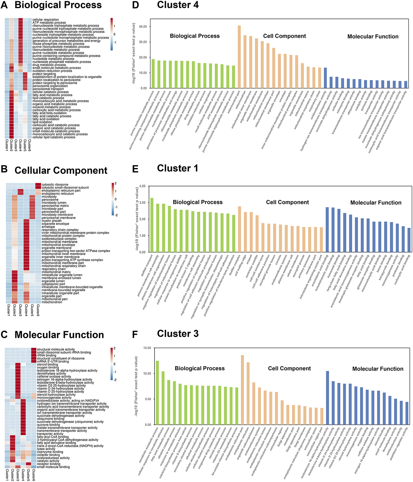 GO enrichment analysis showed that the six clusters were largely related to specific BP, MF, and CC according to the heatmap (Figures 4A–C; Supplementary Table S4). In cluster 4, proteins involved in mitochondrial functions (i.e., respiratory chain complex, mitochondrial protein complex, oxidoreductase complex, and mitochondrial respiratory chain) formed a specific focus in the GOCC. In particular, cluster 4 included proteins related to ATP metabolic processes and nucleotide metabolic processes (i.e., nucleoside triphosphate metabolic and purine nucleoside monophosphate metabolic processes) in GOBP and proteins related to oxidoreductase activity and transmembrane transporter activity (i.e., transmembrane transporter activity of hydrogen ions, and carboxylic acid, organic acid, and malate transport) in GOMF. In the histogram containing the top 15 items sorted by p value, strong enrichment of drug metabolic process and small molecule metabolic process were found in cluster 4 (Figure 4D). A specific focus of GO terms in cluster 1 was not observed in the heat map, so the top 15 terms sorted by p-value was displayed in the histogram (Figure 4E). In cluster 1, GOBP demonstrated strong enrichment of plasma membrane raft assembly and organization, the regulation of mitochondrial fusion, and protein kinase C signaling, and GOCC included proteins related to the cell-cell contact zone, endomembrane system, plasma membrane rafts, and primary lysosomes. GOMF enrichment demonstrated that most of the DEPs were involved in binding, including arachidonic acid binding, fatty acid binding, glutamate receptor binding, protease binding, and carboxylic acid binding. The protein expression trend of DEPs in cluster 3 was opposite to that in clusters 1 and 4. Cluster 3 contained the ER proteins enriched in GOCC and proteins related to lipid catabolic processes in GOBP. Liver-specific functional proteins such as those for steroid binding, sex hormone biosynthesis (i.e., testosterone 16-alpha-hydroxylase activity, testosterone 6-beta-hydroxylase activity, and estrogen 16-alpha-hydroxylase activity), and vitamin D metabolism (i.e., vitamin D 25-hydroxylase activity, vitamin D3 25-hydroxylase activity, and vitamin D 24-hydroxylase activity) were enriched in cluster 3 GOMF. Additionally, we also observed strong enrichment of vitamin D biosynthetic and cellular alcohol metabolic processes in the histogram (Figure 4F).
