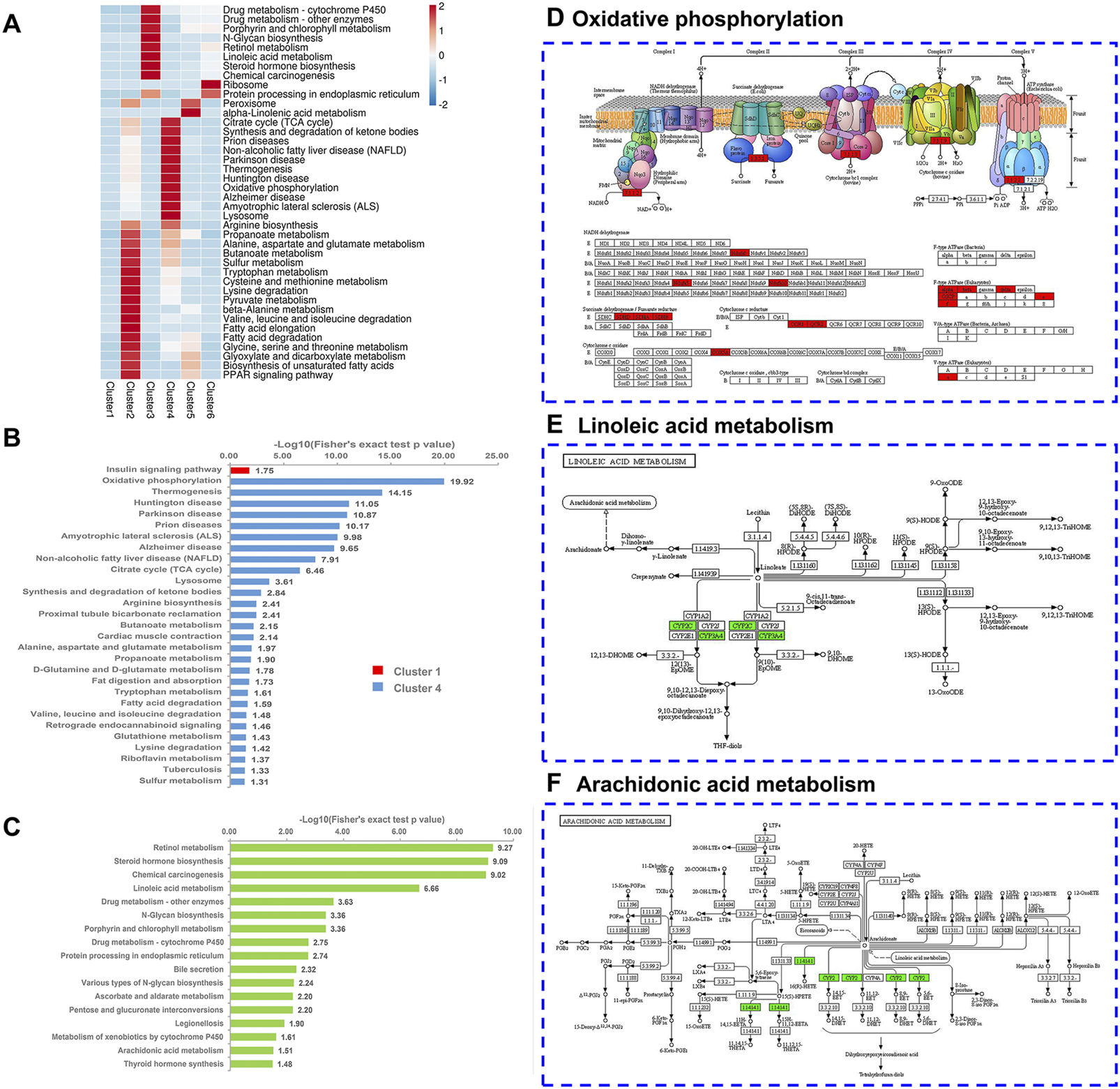 KEGG pathway enrichment based on Mfuzz clustering. (A) Heatmap of KEGG pathway enrichment. The heatmap scale is based on Z scores ranging from −2 (blue) to 2 (red) with a midpoint of 0 (white); p-value < 0.05. (B,C) KEGG pathway-based enrichment analysis is divided into two subgraphs: cluster 1 and cluster 4 (B), and cluster 3 (C). Cluster 1, cluster 4, and cluster 3 are represented in red, blue, and green, respectively. (D–F) Characteristic KEGG pathways with cluster 3 and 4 proteins were obtained. Cluster 4 proteins are labeled in red on the oxidative phosphorylation (OXPHOS) map (D). Cluster 3 proteins are marked in green on both the linoleic acid map (E) and the arachidonic acid map (F).