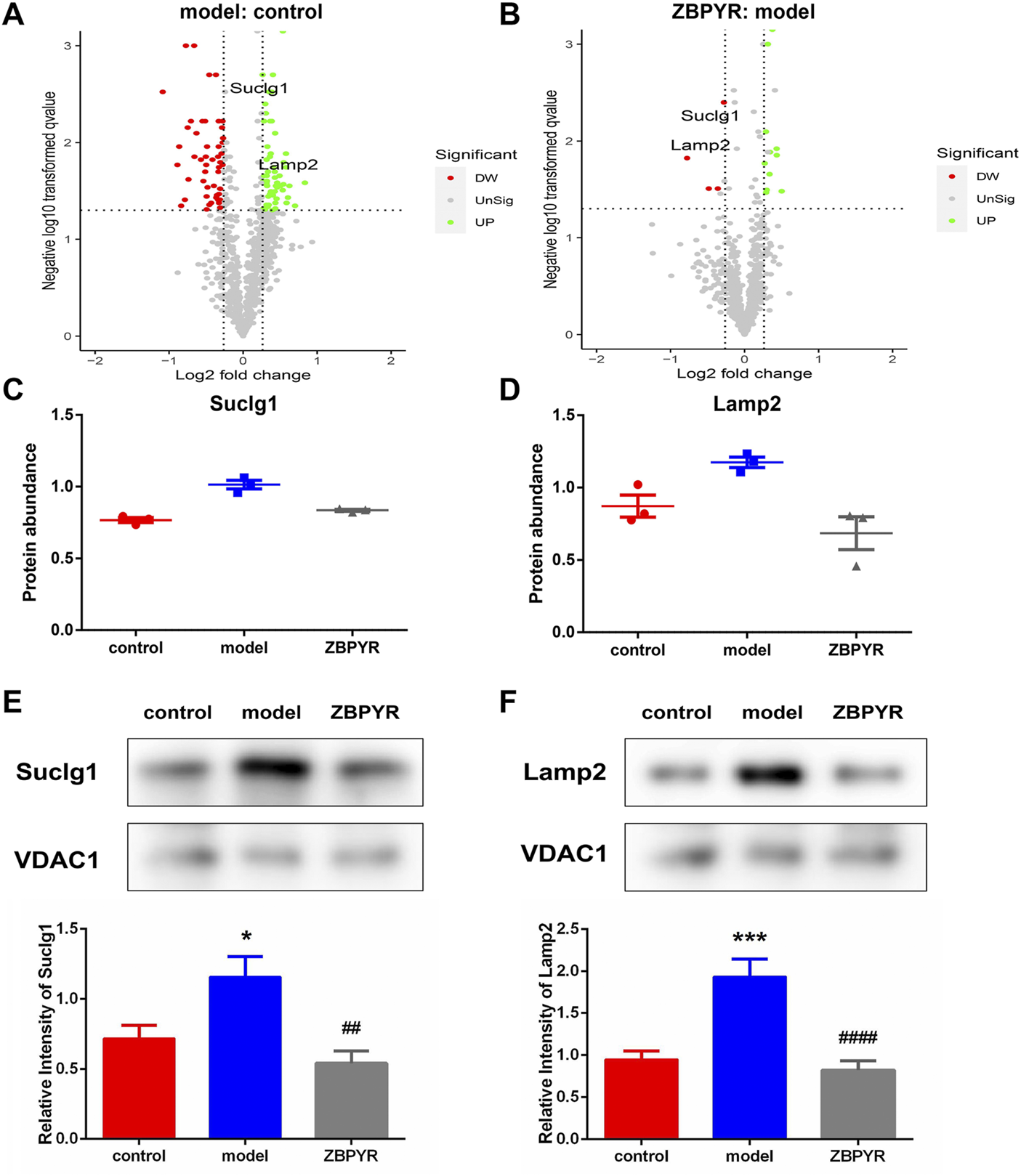 Screening of key proteins. (A,B) Volcano plots showing log2 fold-change (x-axis) and −log10 p-value (y-axis) for quantitative proteins in the model:control (A) and ZBPYR:model (B) groups. The decreased and increased proteins are marked by red and green, respectively. (C,D) Relative abundance of the two key liver MAM proteins in model:control and ZBPYR:model groups (mean ± SEM, n = 3 per group). Suclg1 (C) and Lamp2 (D) were consistent with the key protein screening criteria: 1) the fold change of protein relative abundance > ±1.2; 2) t-test p-value < 0.05; and 3) the opposite expression trend of upregulation and downregulation in the two groups. (E,F) Western blotting analysis for two key proteins. MAM fractions from the control, model, and ZBPYR groups were analyzed by Western blotting using antibodies against Suclg1 (E) and Lamp2 (F). VDAC1 was used to ensure equal protein loading and transfer. The levels of Lamp2 and Suclg1 were normalized relative to VDAC1 levels. *p < 0.05, ***p < 0.001, ##p < 0.01, ####p < 0.0001 (mean ± SEM, n = 3 per group).