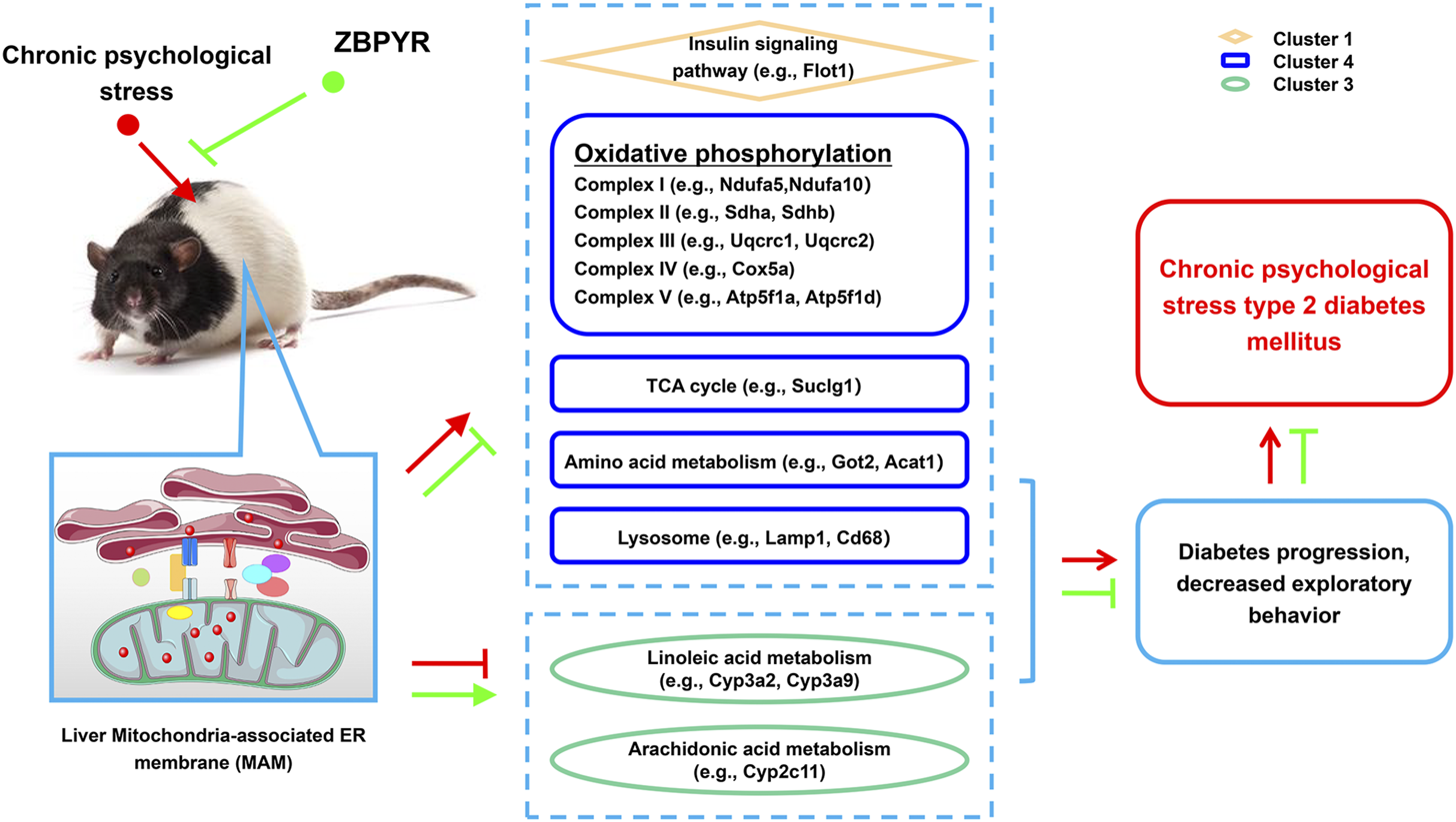 Type 2 diabetes mellitus (T2DM) is a metabolic disease caused by the loss of insulin sensitivity and pancreatic β-Cells failure. The basic characteristic of T2DM is hyperglycemia, and typical symptoms of T2DM are polydipsia, polyuria, polyphagia, and weight loss. The pathogenesis of T2DM is complicated and still not completely understood. A group of emerging literatures show that stress plays an important role in the etiology of T2DM, which is not only a predictor of new onset T2DM, but also a prognostic factor for patients with T2DM (Sui et al., 2016; Hackett and Steptoe, 2017). Repeated or continuous stress exposure results in chronic unsteady load, accompanied by glucose metabolism disorder and neuroendocrine dysfunction, as well as chronic low-grade inflammation. In patients with confirmed diabetes mellitus, depression and diabetes-related distress are associated with poor glycemic control and cardiovascular complications (Hackett and Steptoe, 2017). Therefore, the chronic psychological stress T2DM model has been established by chronic psychological stress stimulation in well-accepted Zucker diabetic fatty (ZDF) rats with T2DM. We used this model to elucidate the specific molecular mechanisms underlying T2DM with chronic psychological stress.