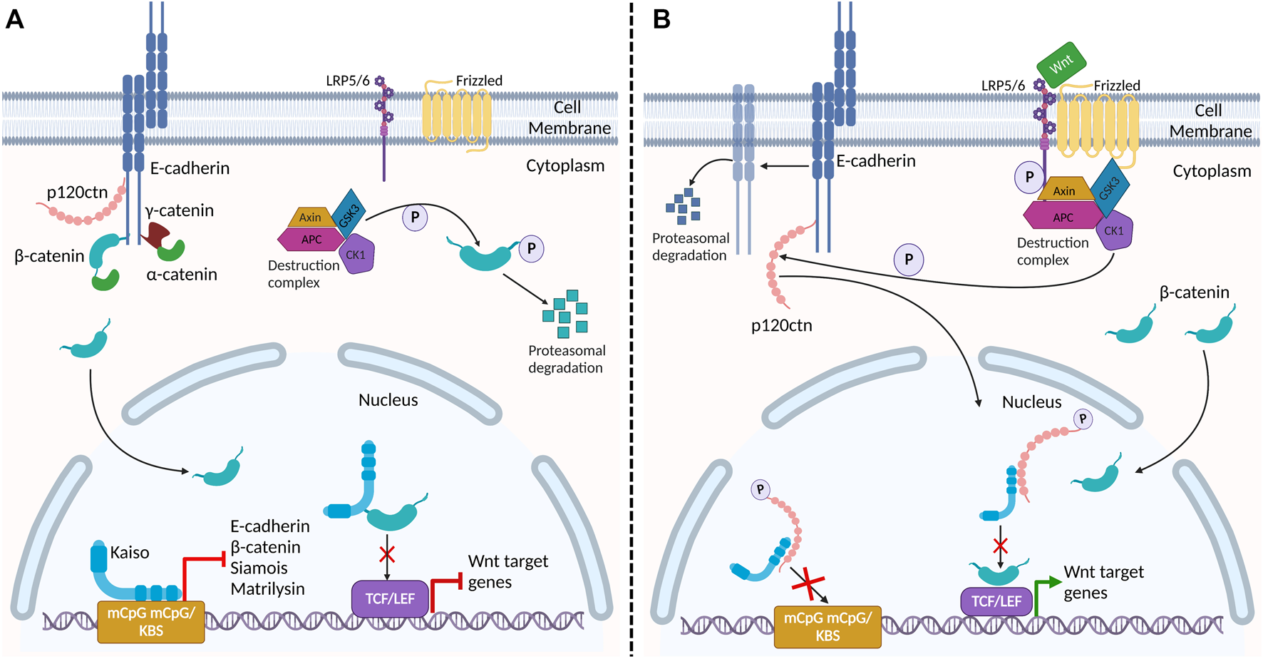 In addition to p120ctn, one study revealed that Kaiso also associates with β-catenin (del Valle-Pérez et al., 2016). β-catenin interacts with Kaiso using Arm repeats 1-6, which partially overlaps with the region required for binding TCF (Arm repeats 3–10). In fact, ectopic Kaiso expression has been found to abrogate binding between β-catenin and TCF (Park et al., 2005; del Valle-Pérez et al., 2016), while Kaiso depletion enhanced this interaction (Park et al., 2005). Furthermore, Liu et al. (2014) demonstrated that Kaiso binds to CpG dinucleotides in the CTNNB1 gene promoter (which encodes β-catenin) in a methylation-dependent manner and that high Kaiso expression repressed transcription of β-catenin mRNA. As such, Kaiso directly impacts canonical Wnt signaling at the DNA level (by repressing gene expression of canonical Wnt target genes and CTNNB1), and protein level (by binding to nuclear β-catenin) (Park et al., 2005; Liu et al., 2014). Importantly, p120ctn has been shown to interfere with Kaiso’s repression of the β-catenin/TCF4 transcription complex in SW480 colon cancer cells (del Valle-Pérez et al., 2016). del Valle-Pérez et al. (2016) showed that Wnt stimulation resulted in p120ctn nuclear translocation that disrupted Kaiso-mediated transcriptional repression and potentiated Wnt/β-catenin signaling. The antagonistic relationship between Kaiso and p120ctn suggests that these two proteins may have opposing roles in regulating the Wnt/β-catenin pathway in intestinal tissues (Figure 3). These observations may explain the increased tumour burden, decreased lifespan, and increased Wnt target gene expression in KaisoTg;ApcMin/+ mice (Pierre et al., 2015), although this is yet to be tested empirically.