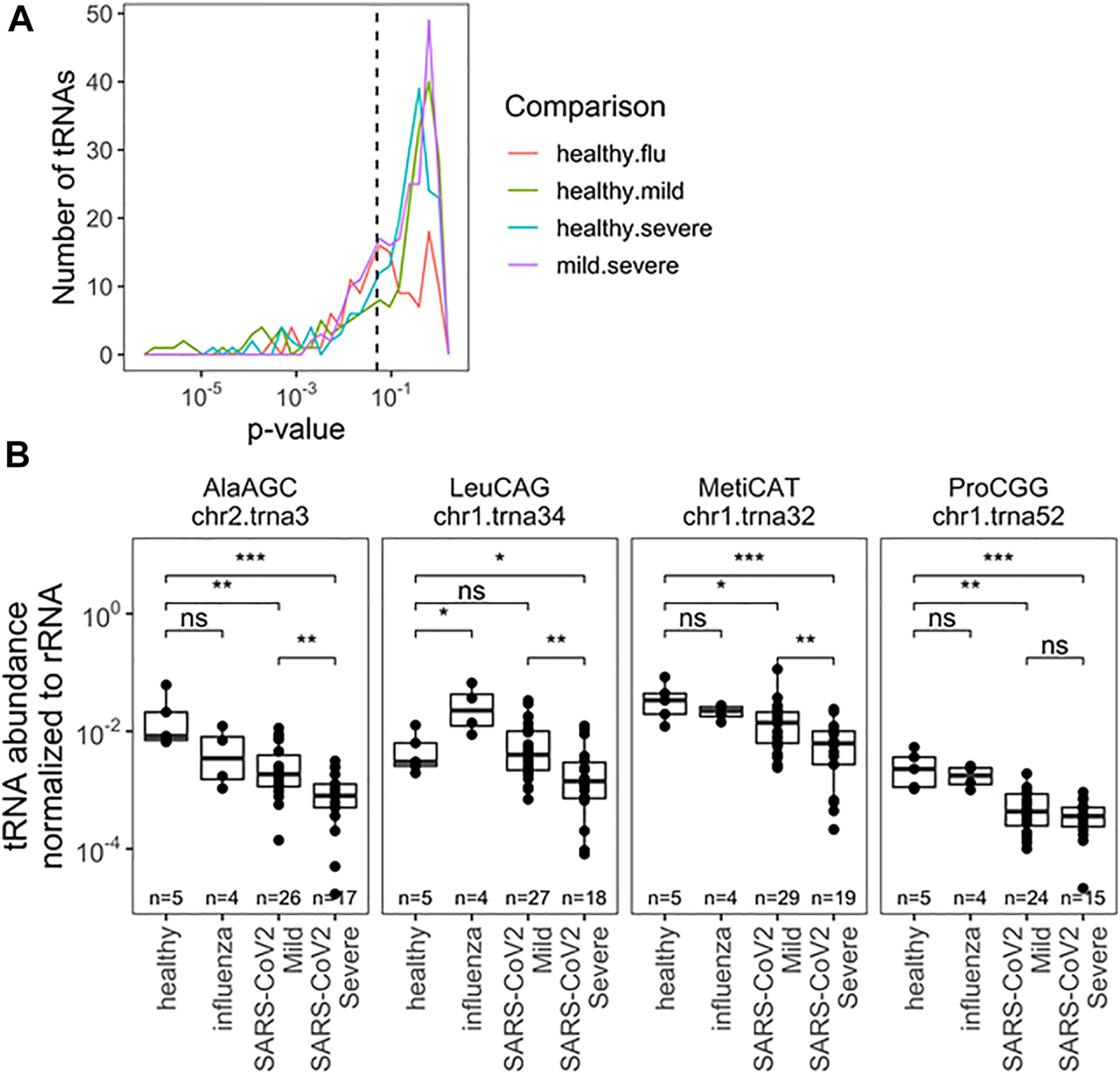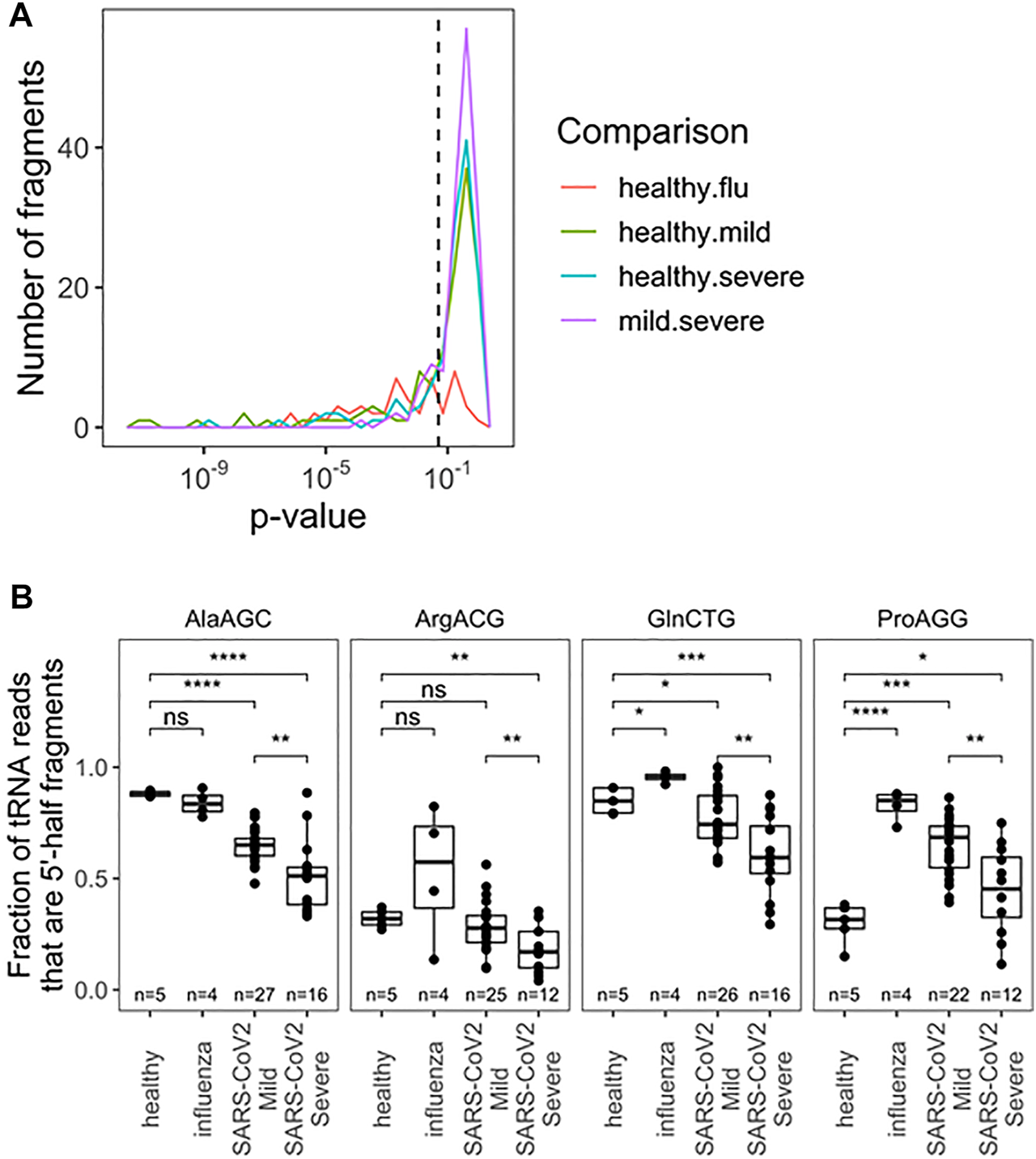 Fragmentation profile of specific tRNA Isoacceptor families allows for seperation of RNA obtained from nasophary swabs collected from SARS-CoV-2 infected individuals who developed mild or severe symptoms. (A) Uncorrected p-Values for pairwise two-sided t-tests indicate several notable differences in fragmentation amoung specific tRNA isoacceptor families. Precise values are indicated in table S2. (B) Fragmentation profies for top anticdon-cleaved tRNAs are hightlighted:tRNAAla, tRNAArg(ACG), tRNApro(AGG), and tRNAGIn(CTG). In addition to distinguising among SARS-CoV-2 patients, fragmentation can provide diagnostic insight which compared to healthy patients. p-values:*<0.05; **<10−2;***<10−3;****<10−4. Two-side t-tests with the number of samples passing a 10 read fliter indicated in each plot.