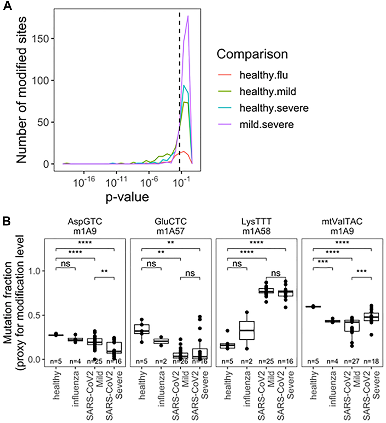 Rspecific tRNA modification profile in RNA obtained fromnasopharyngeal swabs allows for seperation of uninfected, influenza and SARS-CoV-2 infected individuals with mild or severe Covid -19 symptoms). (A) Uncorreced p-Values for pairwise two-sided t-tests indicate differences amoung specific tRNA modifications. Modifications are detected as a “muation” derived from reverse transcriptase disincorporation when reading modified bases. Analysis includes sites with >2% mutation rate and >50 mapped reads. Precise values are indicated in table S4. (B) Modifications exhibiting notable patterns are highlighted m1A9 on tRNAAsp(GTC), m1A58 on tRNAGlu(CTC), m1A58 on tRNA1ys(TTT),m1A9 on mt-tRNAVal(TAC). p-values.*<0.05; **<10−2;***<10−3;****<10−4. Two-side t-tests with the number of samples passing a 50 read fliter indicated on each plot-the 2% mutation rate filter was relaxed after individual sites were chosen.