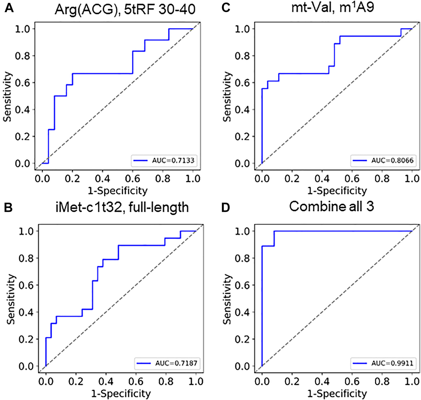ROC curves of using tRNA abundance, modification, and fragmentation as biomarkers Individual curves of (A) fragmentation (tRNAArg(ACG),5′tRF), (B) abundance (tRNAiMet(CAT)c1t32), (C) modification (tmitochondrial tRNAVal,m1A9) show AUC between 0.71 and 0.81. (D) Combining these 3 generates an AUC of 0.99.
