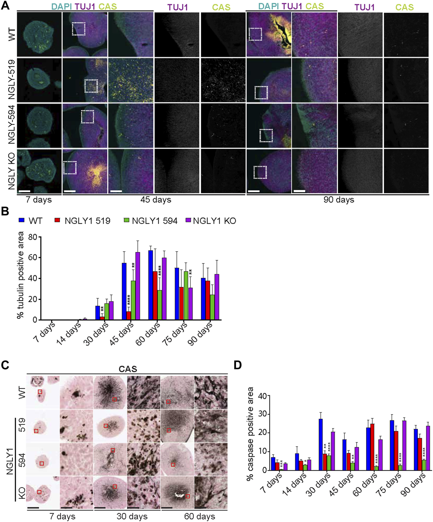 Development and health of organoids as determined by βIII Tubulin (TUJ1) and Caspase3 (CAS) staining in wild type (WT), mutant (NGLY1-519 and NGLY1-594) and knockout (NGLY1 KO) midbrain organoids. (A) Immunofluorescence images at ×5 and ×20 magnification showing DAPI (cyan), TUJ1 (magenta) and CAS (yellow) staining in each line. At 30 days the mutant and KO lines develop a distinct TUJ1 staining pattern relative to the WT, with significantly less density at the edge of the organoid. Scale bars: 125 μm (5x), 25 μm (20x). White dashed line boxes indicate regions of magnification. (B) Quantification of the total TUJ1-positive area in each line at each time point. Bar graph shows the percent of the total tissue area of each line that was positive for TUJ1. Time points where the percentage of TUJ1-positive area in WT organoids was close to zero were excluded. (C) Immunohistochemistry images at ×4 and ×40 magnification showing CAS staining in each organoid line. As organoids grow in size, regions of intense CAS staining develop at the center of the wild type and mutant lines. Scale bars: 250 μm (4x), 25 μm (40x). Red boxes indicate regions of magnification. (D) Quantification of the total CAS-positive area in each line at each time point. Bar graph shows the percent of the total tissue area of each line that was positive for CAS. Data representative of all slices derived from three midbrain organoids. Statistical significance determined by multiple t-test analysis denoted by * = (p ≤ 0.05), ** = (p ≤ 0.01), *** = (p ≤ 0.001), **** = (p ≤ 0.0001).