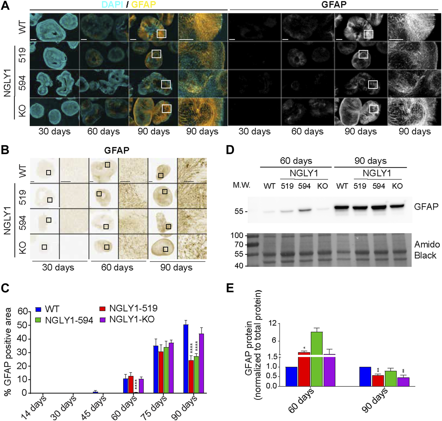 Development of astrocytes in midbrain organoids characterized by GFAP expression. (A) Representative immunofluorescence images at ×5 and ×20 magnification showing DAPI (cyan) and GFAP (yellow). Scale bars: 250um (5x) and 50um (20x), white boxes indicate zoomed in region. (B) Representative bright field images of GFAP immunohistochemistry staining at ×4 and ×20 magnification. Scale bars: 250um (4x) and 50um (20x), black boxes indicate zoomed in region. (C) Quantification of total percent positive GFAP staining. (D) A representative western blot showing GFAP expression in cell lysates obtained from control and NGLY1 disease midbrain organoids. (E) Quantification of GFAP protein expression normalized to total protein. Data representative of all slices derived from three midbrain organoids. Statistical significance determined by multiple t-test analysis denoted by * = (p ≤ 0.05), ** = (p ≤ 0.01), *** = (p ≤ 0.001), **** = (p ≤ 0.0001).