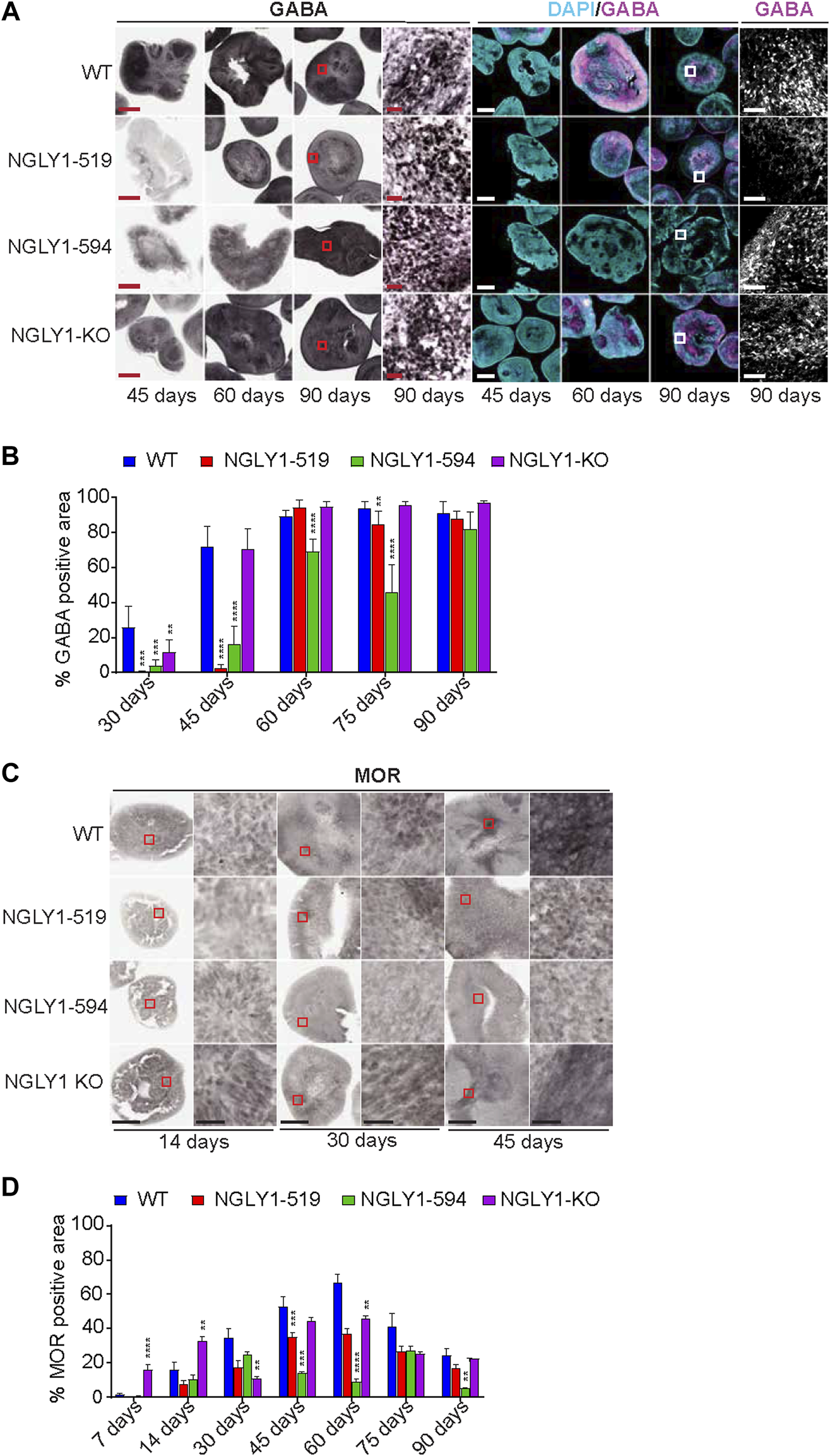 Expression of GABA and MOR in NGLY1 midbrains. (A) Representative images using brightfield and immunofluorescence microscopy for WT, NGLY1 diseased and NGLY1 KO midbrain organoids stained with antibody against GABA at different timepoints (45, 60 and 90 days). Scale bars: 500 µM (for 45, 60 and 90 days) and 50 µM (for 90 days zoomed in image). (B) Graph showing percent total GABA positive signal in different organoids at different timepoints. (C) Representative brightfield immunohistochemistry images for MOR expression at ×4 and ×40 magnification. Scale bars: 250um (4x) and 25um (40x), red boxes indicate zoomed in region. (D) Quantification of total percent positive MOR staining. Data representative of all slices derived from three midbrain organoids. Statistical significance determined by multiple t-test analysis denoted by * = (p ≤ 0.05), ** = (p ≤ 0.01), *** = (p ≤ 0.001), **** = (p ≤ 0.0001).