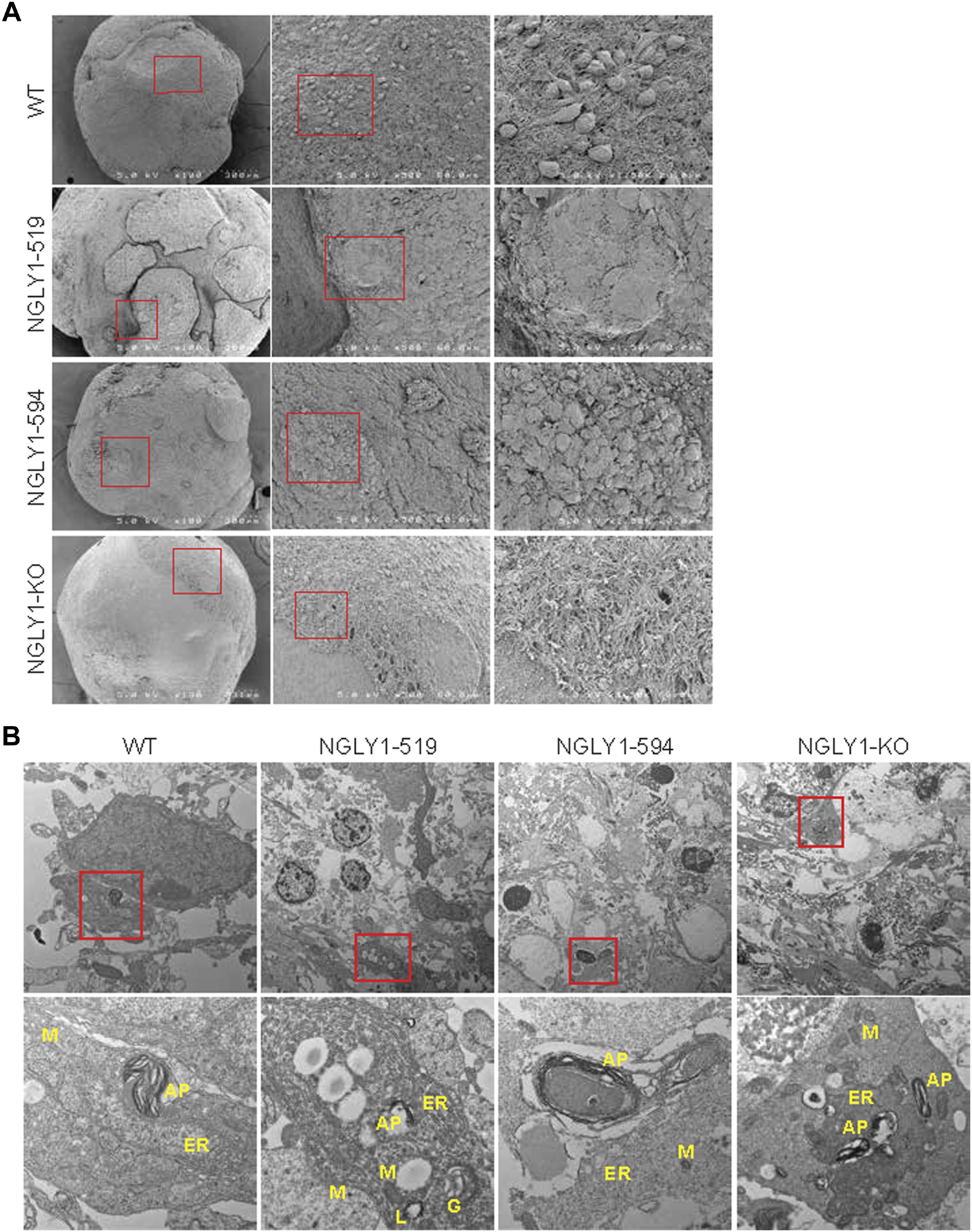 Electron microscopy reveals structural differences in NGLY1 deficient midbrain organoids We performed scanning electron microscopy (SEM) and transmission electron microscopy (TEM) to analyze the overall topography of the midbrain organoids and the subcellular structures of the cells within midbrain organoids (Figure 6). Compared to the WT organoids, the NGLY1 diseased midbrain organoids appeared smoother and with less obvious cell bodies, although the NGLY1 KO line showed this effect to a lower degree (Figure 6A). This observation concurs with our previous result showing reduced TUJ1 staining on the outer region of the NGLY1 deficient organoids. This phenomenon could be partly attributed to reduced expression of extracellular matrix proteins in NGLY1 deficient organoids, as determined by proteomic and RNA-seq analysis in this study. By TEM analysis regions with accumulation of vesicles, including autophagosomes, were more often found in NGLY1 deficient lines. Additionally, autophagosomes in the NGLY1 patient lines appeared to be larger in size (Figure 6B). This observation is in line with recent findings indicating dysregulated autophagy associated with NGLY1 deficiency (Mueller et al., 2020; Needs et al., 2022).