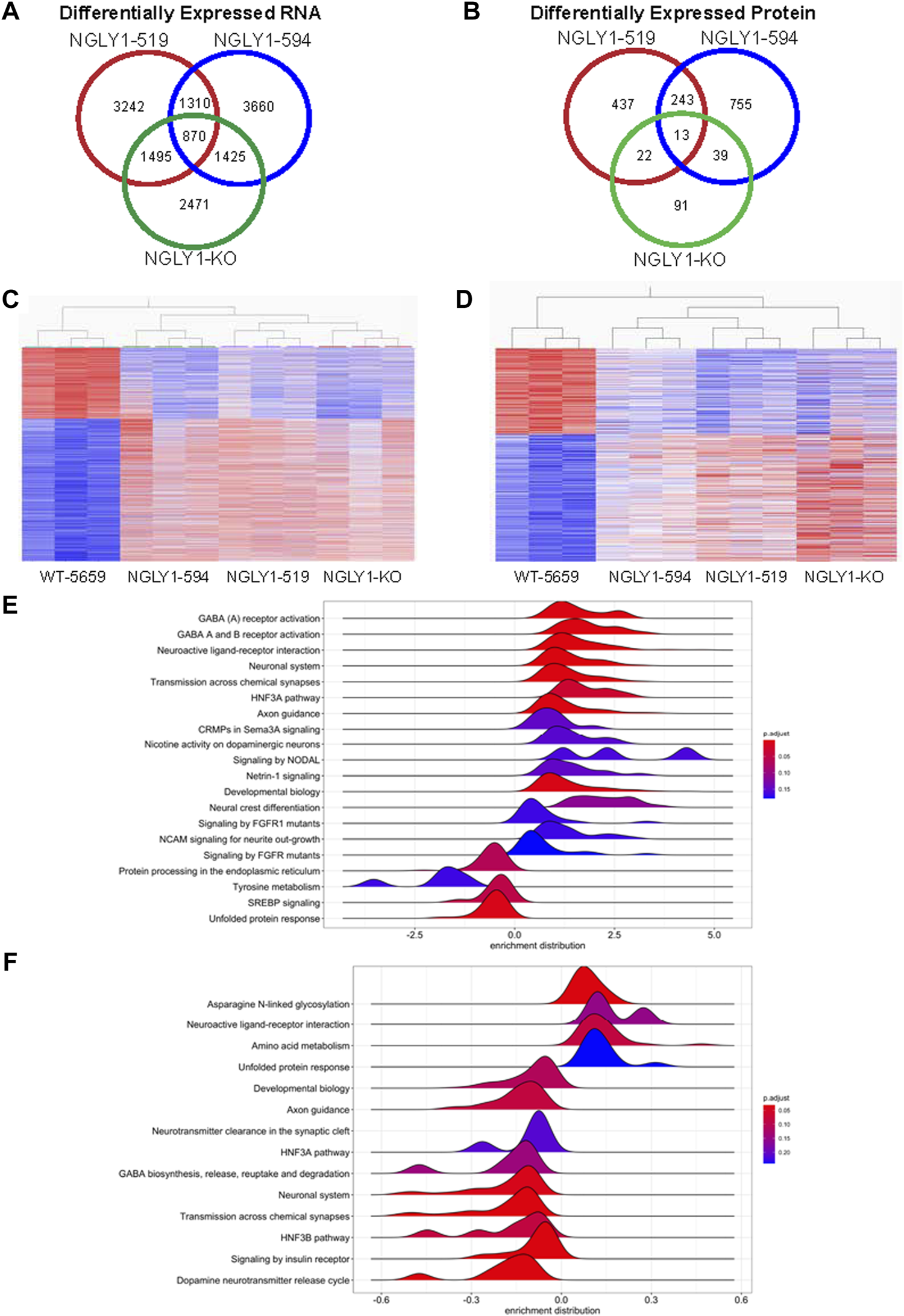 RNA-seq analysis and quantitative proteomic profiling was carried out on NGLY1 midbrain organoids at day 90. Genes were determined to be differentially expressed with a cutoff of a Log 2-Fold Change greater than |1| and a FDR below 1%, proteins were determined to be differentially expressed with a 30% change and an FDR below 5%. NGLY1-519 and NGLY1-594 harbor different NGLY1 mutations and share 1310 genes and 243 proteins that are similarly differentially expressed (Figures 7A, B). The CRISPR generated NGLY1 knockout exhibited a different genomic and proteomic profile than the patient derived midbrain organoids. Including the data from the differential expression analysis of the NGLY1-KO midbrain organoids; there were 870 genes differentially expressed and 13 proteins.