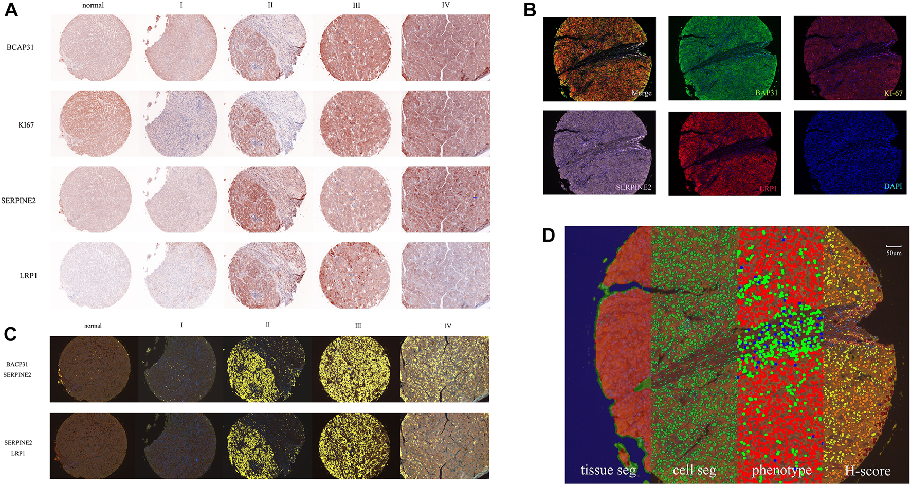 The whole process of data and image acquisition: (A) The expression levels of four biomarkers in different stages were determined by multiplex immunohistochemistry staining technology. The darker color indicates that the biomarker expression showed an upward trend. (B) A stained core was multispectral unmixed, the merged image was unmixed into five pictures: Opal520-stainig BAP31 (green), Opal570-stainig Ki-67 (brown), Opal620-stainig SERPINE2 (pink), Opal690-stainig LRP1 (red) and DAPI (blue). (C) Colocalization of BAP31 and SERPINE2. The colocalization analysis was performed. The percentage of colocalization area (golden) was calculated. (D) All three steps to train the inForm for segmentation and the calculation of the H-score. From left to right are the tissue segmentation, cell segmentation, phenotype and H-score. Each step is a further analysis based on the previous step. Different tissues were first divided into cancer (red), stromal (green), and background (blue) tissues. Then, the cells were segmented. Finally, the software-trained algorithm recognized cancer cells (red), immune cells (green), and stromal cells (blue). According to the biomarker expression level, we set thresholds to divide cells into 4 grades (blue means no expression, yellow means +1 expression, orange means +2 and brown means +3) and calculated the H-score.