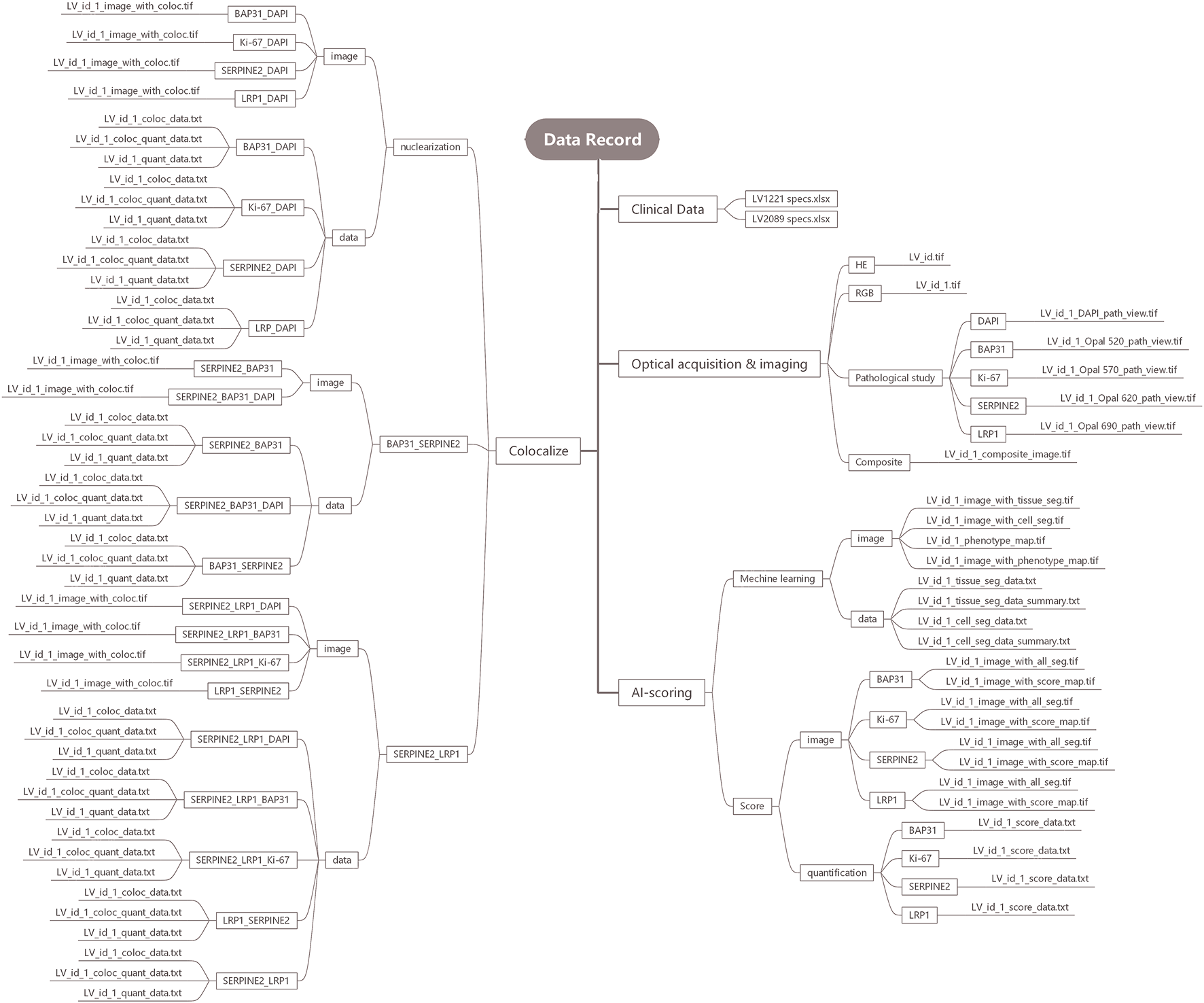 We processed the cores from tissue microarrays LV2089 and LV1221 by inForm v2.4.1 and built the data records. The data records are organized into four folders, including Clinical data, Optical acquisition and imaging, Machine Learning (artificial intelligence, AI) based ROI scoring, and Colocalize. The structure of our data records is shown in Figure 2.