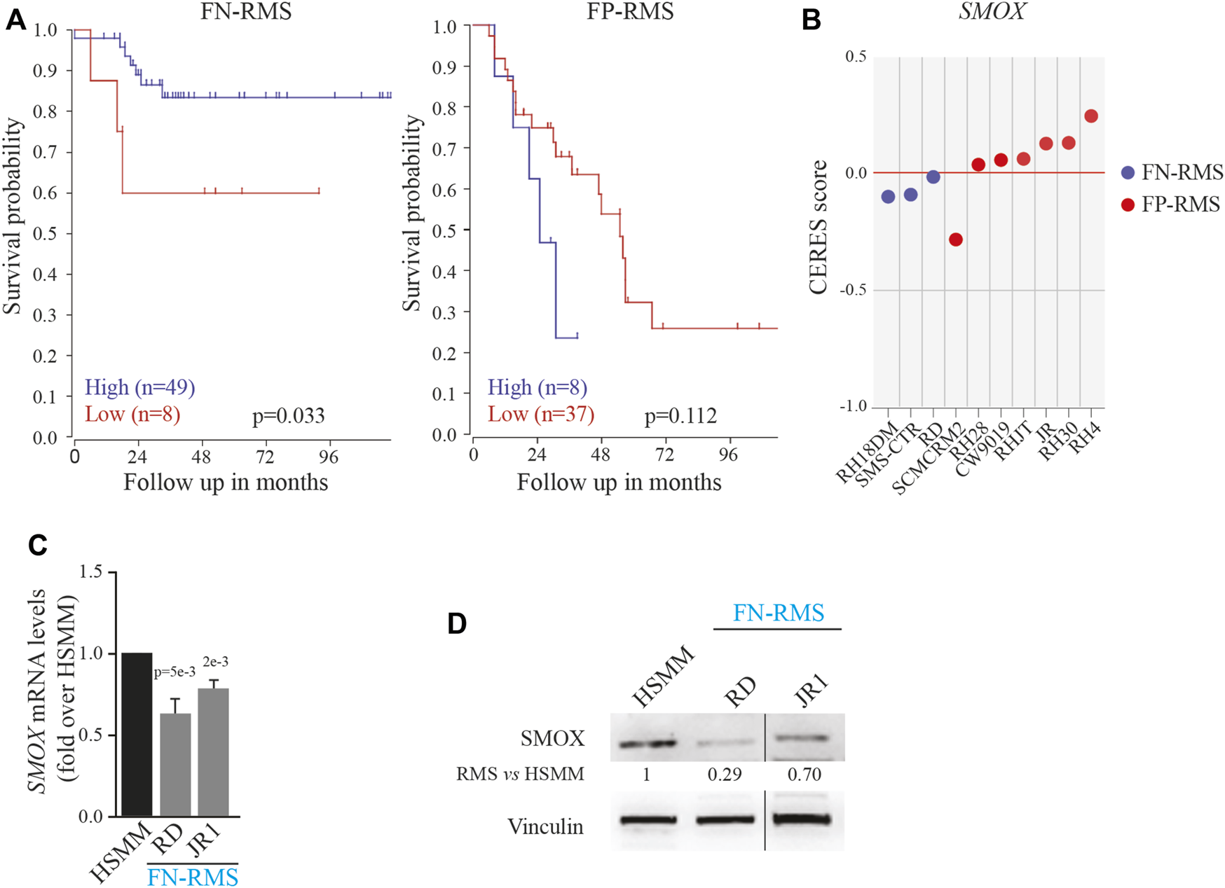 We show here that patients of the FN-RMS subtype with low levels of SMOX have a worse prognosis compared to those with high expression. Moreover, analysis of a cancer dependency map dataset revealed no dependency on SMOX of FN-RMS cell lines after deletion of the gene. In this regard, we have also observed that 2 cell lines derived from high-risk (recurrent and p53-mutated) FN-RMS tumors display lower protein and mRNA levels of SMOX as compared to normal proliferating myoblasts, used as healthy control.