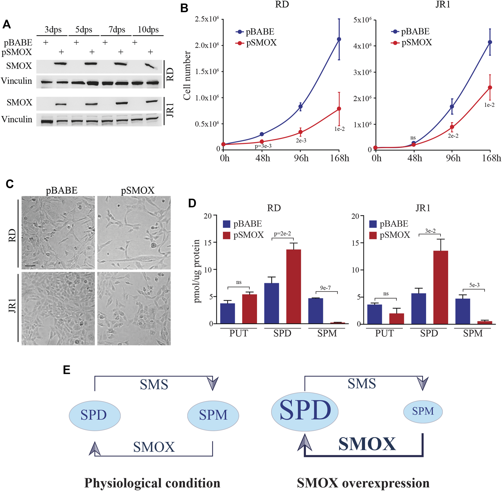 SMOX overexpression in FN-RMS cell lines reduces cell proliferation. (A) Representative western blot (n = 3 independent biological replicates) depicts SMOX overexpression at 3, 5, 7, and 10 days post selection (dps) with puromycin in RD and JR1. Vinculin was used as loading control. (B) Growth-curve analysis of RD and JR1 at 0, 48, 96, and 168 h post seeding. Graph represents the mean of three independent experiments ±SD, Student two-tailed t-Test. Exact p-values are reported in the figure. (C) Representative images of SMOX overexpressing-RD and -JR1 96 h post seeding. Scale Bar = 100 μm. (D) Histograms of putrescine (PUT), spermidine (SPD) and spermine (SPM) concentrations expressed as pmoles/µg of protein in SMOX overexpressing-RD and -JR1 cells. Graph represents the mean of three independent experiments ±SD, Student two-tailed t-Test. Exact p-values are reported in the figure. (E) Schematic representation of SPD and SPM concentration balance in our experimental condition. In physiological conditions (left) SMS and SMOX enzymes maintain the balance between SPM and SPD concentration. SMOX overexpression (right), induces an imbalance shifts making the SPD the predominant polyamine.