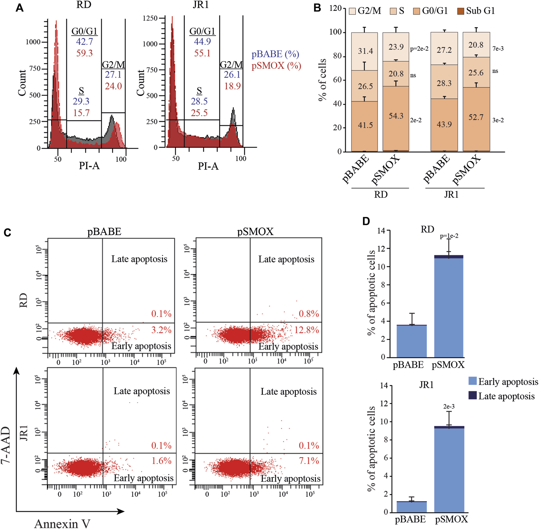 SMOX overexpression in FN-RMS cell lines induces G0/G1 cell cycle arrest and apoptosis. (A) Representative diagrams of flow cytometry analysis of Propidium Iodide (PI) stained RD and JR1 transduced with pBABE and pSMOX and analyzed 24 h post transduction. (B) Histogram depicting the percentage of SMOX overexpressing-RD and -JR1 cells in subG1, G0/G1, S, and G2/M phases. Graph represents the mean of three independent experiments ±SD, Student two-tailed t-Test. Exact p-values are reported in the figure. (C) Representative cytofluorimetric plots of Annexin V/7-AAD (n = 3 independent biological replicates) of RD and JR1 transduced with either pBABE or pSMOX and analyzed 48 h post transduction. (D) Histogram depicting the percentage of Annexin-V positive/7-AAD single- and double-positive RD and JR1 cells. Graphs represent the mean of three independent experiments ±SD, Student two-tailed t-Test. Exact p-values are reported in the figure.