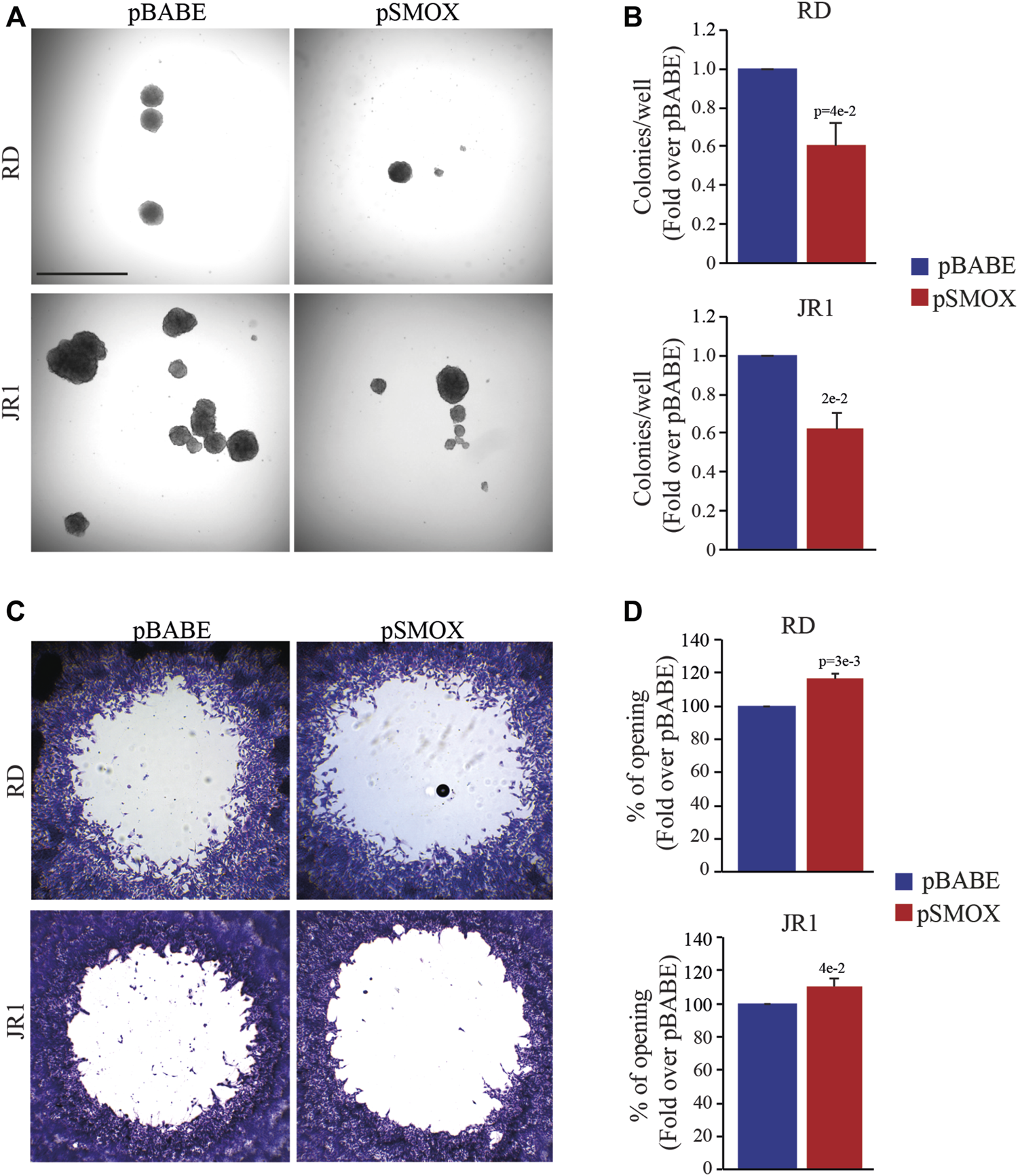 Since the tumorigenicity correlates strictly with the ability of cancer cells to proliferate in the absence of adhesion to extracellular matrix (ECM) proteins, we tested the effect of forced SMOX expression on anchorage-independent growth through soft agar assay considered an in vitro surrogate of the in vivo tumorigenicity testing. Results indicate that forcing the expression of SMOX reduces the ability of RD and IR1 cells to form colonies with respect to control cells (40 ± 8% and 38 ± 6% reduction, respectively) (Figures 4A, B). In addition, SMOX overexpression decreased the migration of RD and JR1 cells by 16 ± 5% and 11 ± 6%, respectively, as compared with pBABE) (Figures 4C, D).