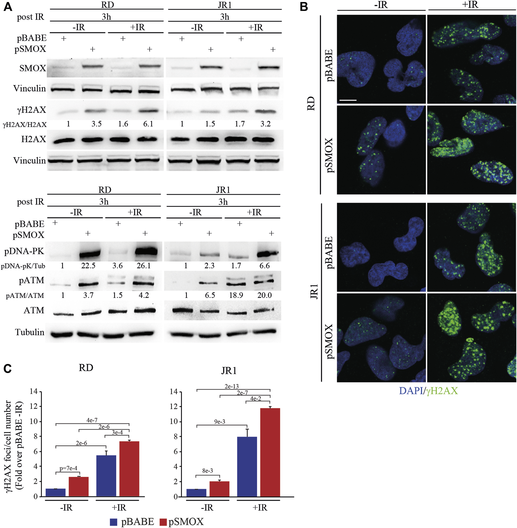 As expected, IR increased the levels of γH2AX in pBABE-infected RD or JR1 cells (5.4 ± 0.6 and 8 ± 1 fold increase in pBABE + IR vs. pBABE) (Figure 6A). Strikingly, when the pSMOX-infected FN-RMS cells were irradiated, the levels of γH2AX were further upregulated (2.8 ± 0.1 and 5.7 ± 0.5 fold increase in pSMOX + IR vs. pSMOX) (Figure 6A). Similarly, IR augmented the number of γH2AX foci in pSMOX-infected compared to pBABE-infected RD or JR1 cells (1.4 ± 0.2 and 1.5 ± 0.2 fold increase pSMOX + IR vs. pBABE + IR in RD and JR1 cells, respectively) (Figures 6B, C).