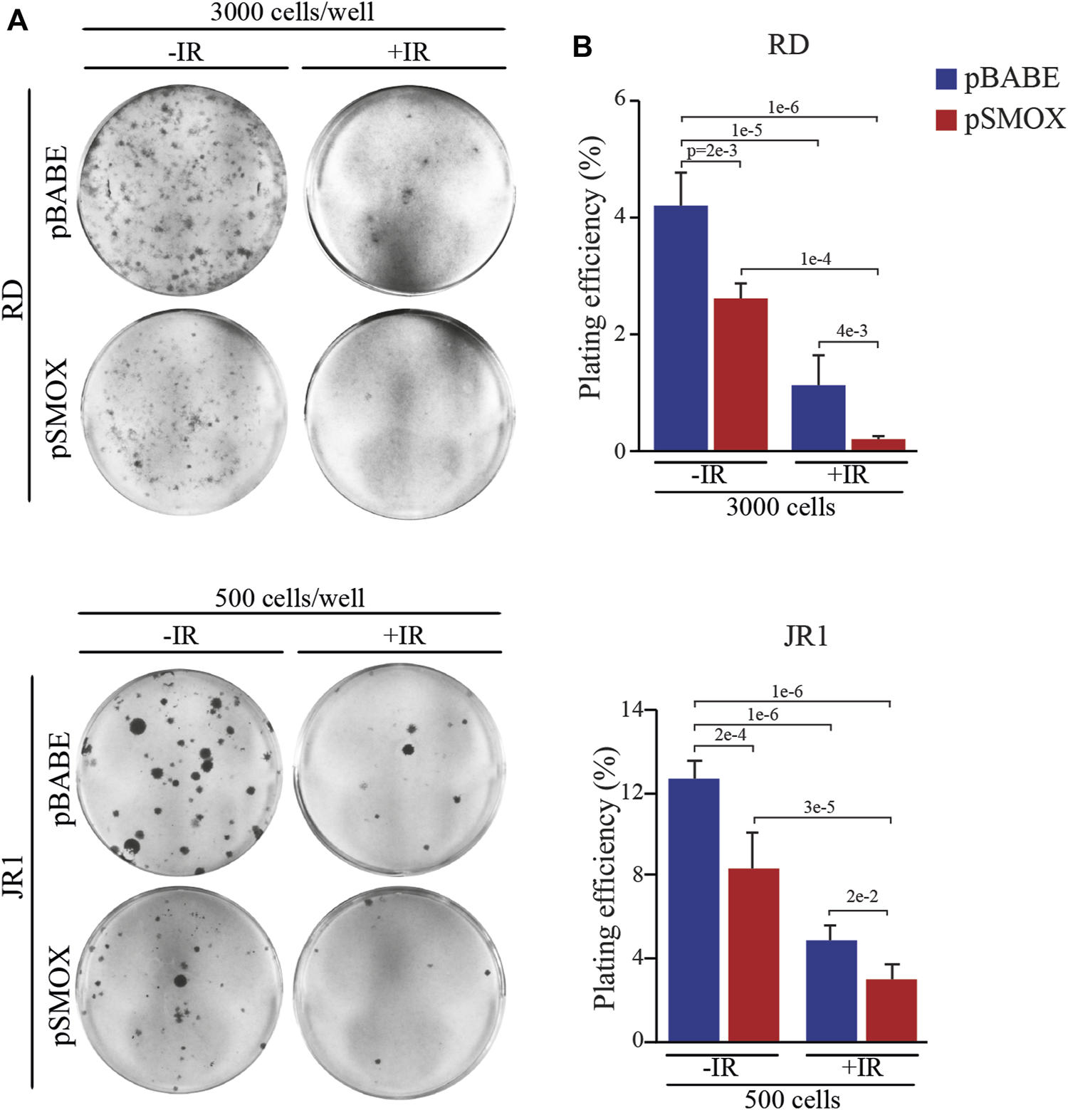 SMOX overexpression radiosensitizes FN-RMS cell lines. (A) Representative pictures of RD and JR1 colonies stained with crystal violet 12 days post seeding. FN-RMS cells were infected with either pBABE or pSMOX and 24 h later irradiated with 2 Gy. The cells were processed 3 h post irradiation. (B) Histograms depicting the plating efficiency (%) of RD and JR1 infected with either pBABE or pSMOX and irradiated (+IR) or not (- IR) with 2 Gy. Graph represents the mean of three independent experiments ±SD, one-way ANOVA. Exact p-values are reported in the figure.