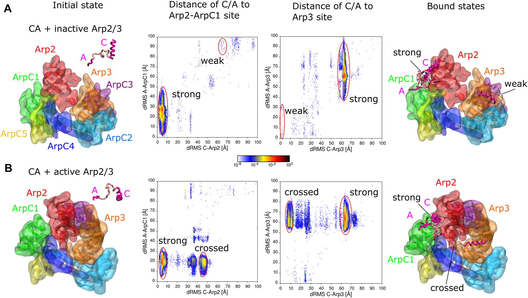 FIGURE 1. Simulations of CA domain binding to inactive and active Arp2/3 complex. (A) Binding of CA to inactive Arp2/3 complex. Left snapshot: initial configuration with CA domain starting separated from Arp2/3 complex. Middle plots: 2D distribution of dRMS values for C and A domains relative to the Arp2-ArpC1 and Arp3 binding sites. dRMS was calculated every 10 time steps. Data binned over .5 × .5 Å2. Regions corresponding to strong and weak binding hotspots indicated with red lines. Right snapshot: Bound configurations corresponding to weak and strong hotspots, with a few overlapping examples shown for the strong case. (B) Same as panel (A), but for active Arp2/3 complex, with representative bound states shown for the strong and crossed bound states. Both simulations performed in a cubic box of side 300 Å for ∼1.6 μs.