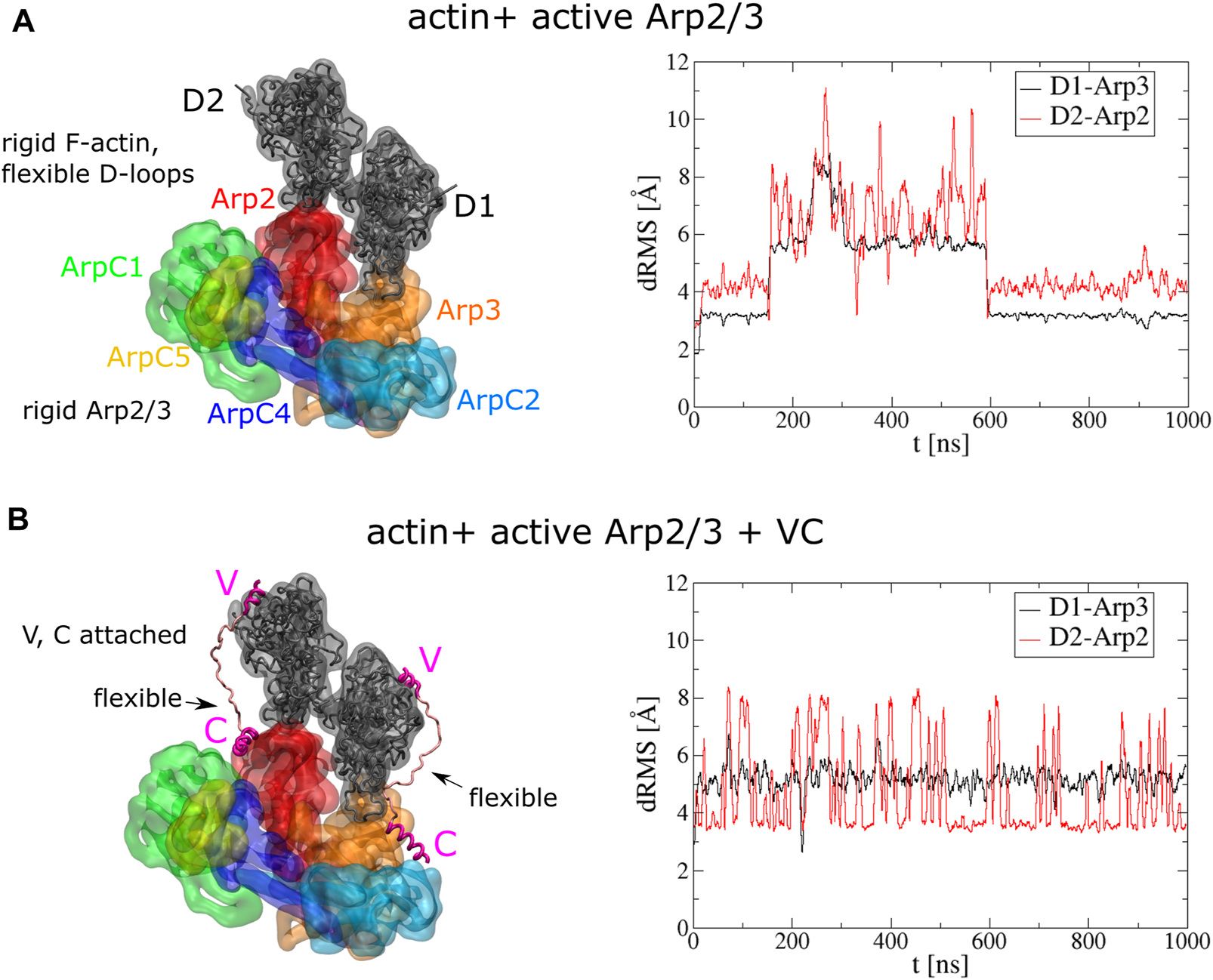 We also performed simulations to study the delivery of actin to Arp2 and Arp3 of the active Arp2/3 complex, where both Arp2 and Arp3 sites (i.e., D1 and D2 subunit locations) are available (Figure 4). We examined the delivery of actin by REMD simulations. We fixed the C domain to either binding site on a rigid Arp2/3 complex, as in Figure 2B. The V domain was rigidly attached to the actin subunit in the F-actin configuration with flexible D-loop as in Figure 2B. The reference configurations for the dRMS calculation were the same as in Figure 2B for each of the simulations.