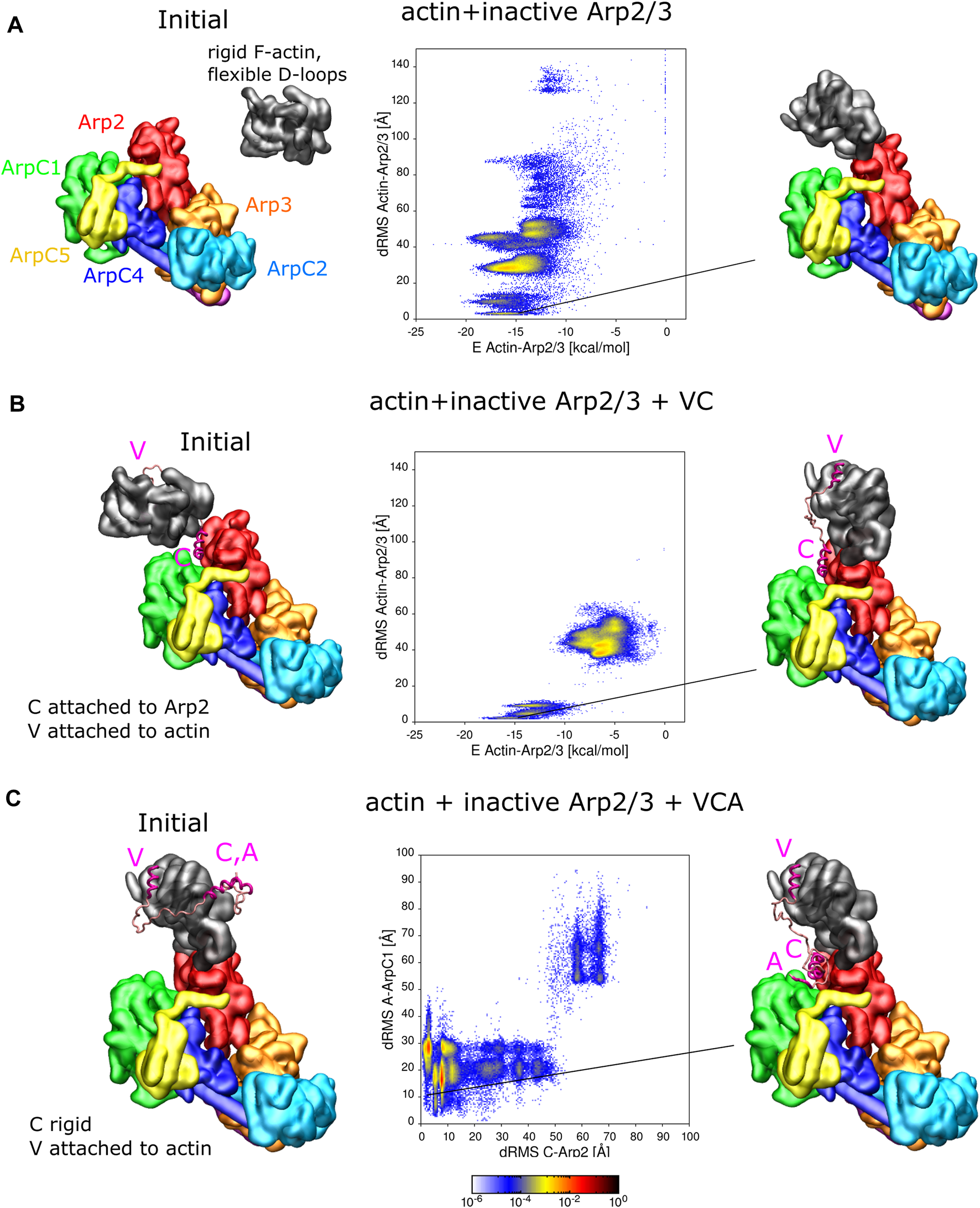 FIGURE 3. Interaction of actin and VCA with inactive Arp2/3 complex. (A) REMD simulations of actin delivery to Arp2 of inactive Arp2/3 complex. The actin monomer is in the rigid F-actin conformation with flexible D-loop. Left: Initial conformation with actin separated from Arp2/3 complex. Middle: 2D-distributions of dRMS vs. binding energy are calculated and plotted in bins of .1 kCal/mol × .5 Å. Right: Example of conformation are randomly selected from the lowest dRMS hotspot. (B) Same as panel A but when actin and Arp2/3 are connected by the VC domain, with V rigidly attached to actin and C domain rigidly attached to the Arp2-ArpC1 site. (C) REMD simulations of CA binding to Arp2/3 complex with V rigidly fixed on actin. The actin monomer is kept fixed in a long pitch configuration. The C helix is kept rigid [in same configuration as panel (B)] and allowed to move with the rest of flexible CA region. Left: Initial conformation with CA separated from Arp2/3 complex. Middle: 2D dRMS distributions of A and C relative to their binding sites on ArpC1 and Arp2, respectively, in bins of .5 × .5 Å. Right: Example from indicated location in dRMS plot. The simulations were performed in cubic boxes of side 300 Å for (A) 780 ns, (B) 1.2 μs, and (C) 1.8 μs.