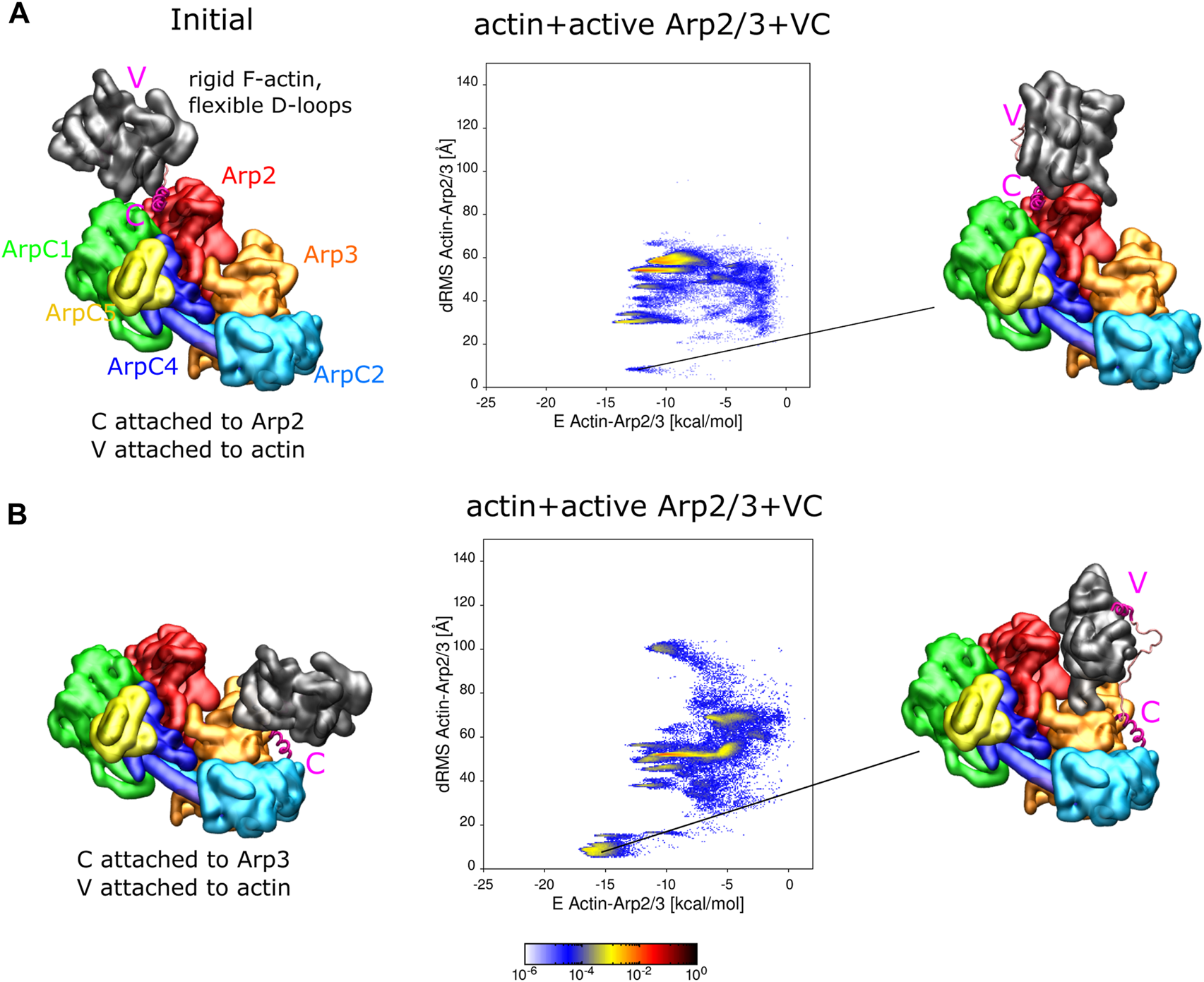 FIGURE 4. Actin binding to active Arp2/3 complex with attached VC domain. (A) REMD simulations of actin delivery to Arp2 of inactive Arp2/3 complex. Actin and Arp2/3 complex are connected by the VC domain, with V rigidly attached to actin and C domain rigidly attached to the Arp2-ArpC1 site. The actin monomer is in the rigid F-actin conformation with flexible D-loop. Left: Initial conformation with actin separated from Arp2/3 complex. Middle: 2D-distributions of dRMS vs. binding energy are calculated and plotted in bins of .1 kCal/mol × .5 Å. Right: Example of conformation are randomly selected from the lowest dRMS hotspot. (B) Same as panel (A) but with C domain attached to the Arp3 site. Simulations performed in cubic boxes of sides 300 Å for (A)