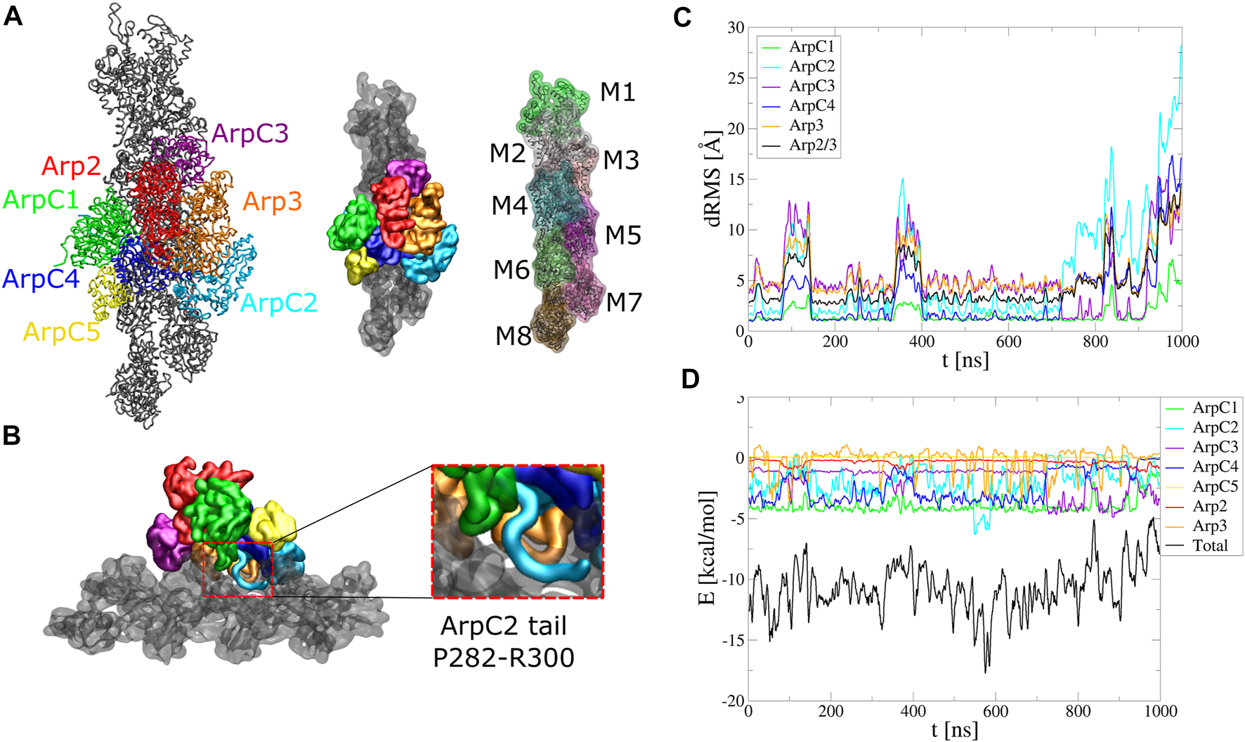 We note that the missing ArpC2 C-terminal tail can lie on either side of the ArpC1 protrusion helix. In Figure 5B we started with the ArpC2 tail between ArpC1 and ArpC5. We also run simulations with ArpC2 C-terminal region built between ArpC1 and ArpC3 (Supplementary Figure S10, Supplementary Movie S8). However, in this case the interaction energy between ArpC2 and the mother actin filament started much weaker and binding of Arp2/3 complex became unstable within 300 ns The ArpC2 tail unbound from the filament quickly and went through a gap between Arp2 and Arp3. Our simulations thus suggest that the ArpC2 tail localizes between the ArpC1 protrusion loop and ArpC5.