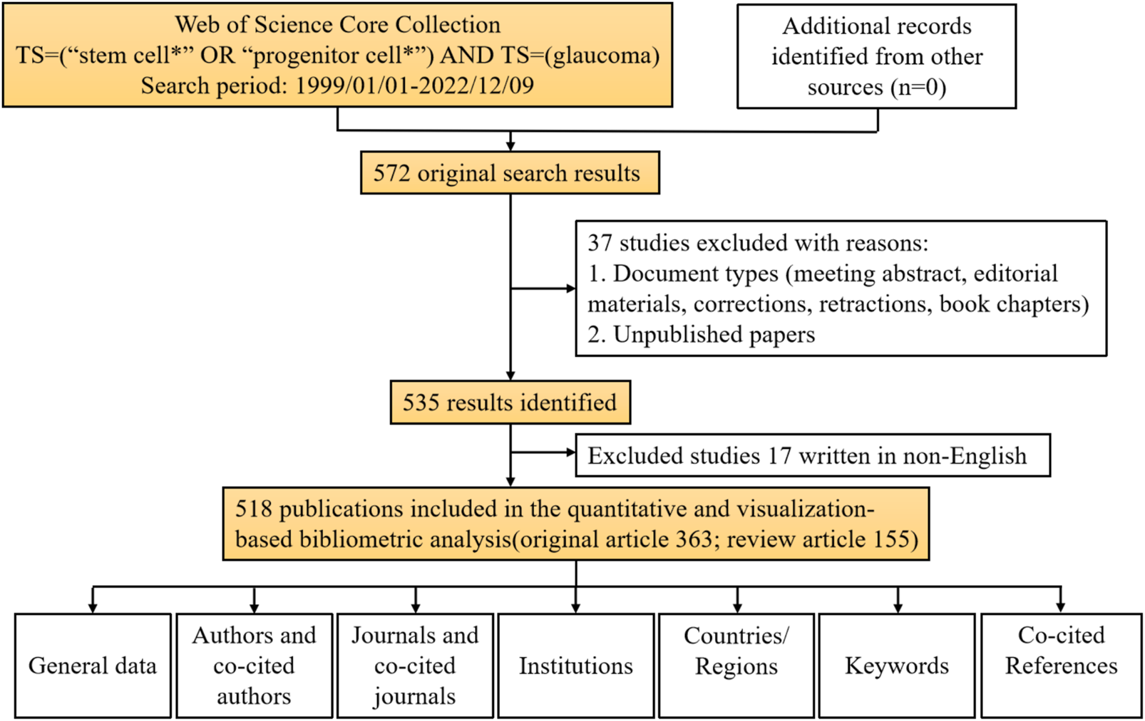 Web of Science (https://login.webofknowledge.com/) was used to perform the search for publications. The search and data acquisition were completed on 9 December 2022. All publications were exported in the format of “Full Record and Cited References” as plain text files. The search formula was as follows [TS= (“stem cell*” OR “progenitor stem cell*”) AND TS= (“glaucoma”)] AND DOP= [(1999-01-01/2022-12-09) AND DT= (Article OR Review)] AND LA= (English). Two investigators (YT and QZ) retrieved and screened the publications. Disagreements were discussed with a third investigator (MM) until a consensus was reached.