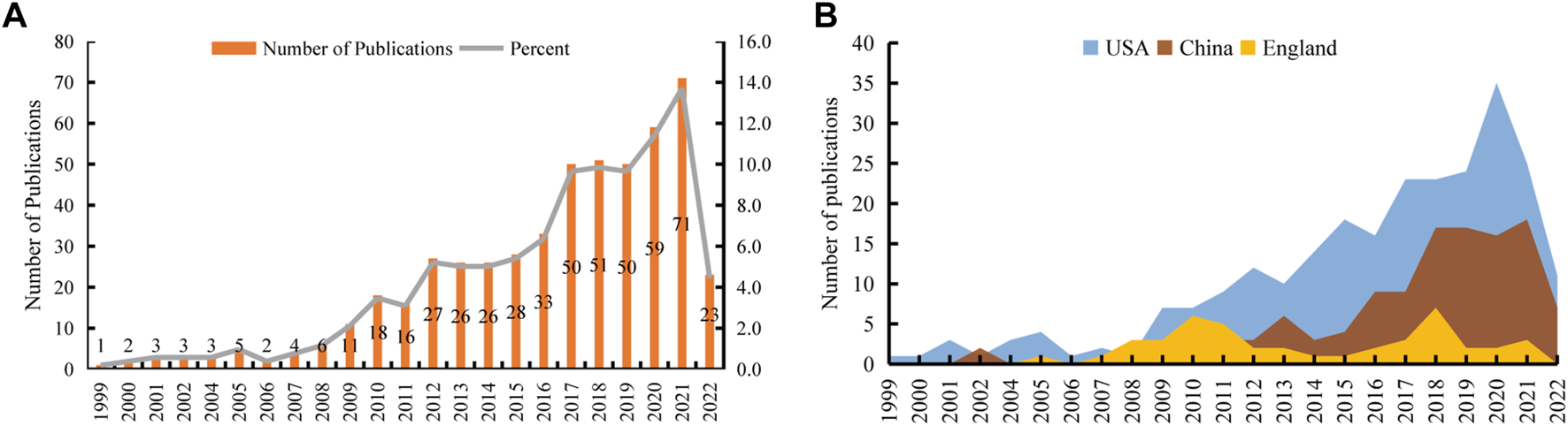 We retrieved 572 publications from the WoSCC database, with publication dates from 1999 through 2022. Then, we limited the search results to English-language original articles and review articles. Eventually, 518 articles were brought into this analysis. There were 363 (70.08%) original articles and 155 (29.92%) review articles (Figure 1). From 1999 through 2008, the number of publications increased slowly, but there were fewer than 10 publications per year. From 2009 through 2016, the field received more attention, and the number of publications increased significantly. From 2017 through 2021, more than 50 articles in this field were published each year. Although the articles we obtained were only published before 9 December 2022, it can still be seen that the number of articles published in this field has decreased significantly in 2022. The peak publication frequency was in 2021 (n = 71) (Figure 2A). The general number of citations was 11069, with 21.37 citations for each paper. Overall 50 countries/regions, 2380 authors, 216 journals, and 712 institutions were represented. The United States, China, and England were the main contributors (Figure 2B).